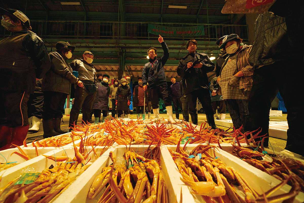 The Kano crab (female snow crab, known locally as Kobako snow crab) season opens in November, and the auction at Hashitate Fishing Port in Kaga is a spectacular sight (left). The thick, rich Noto oysters are farmed in Nanao Bay, which is rich in plankton (right). Photo: Masaaki Miyazawa