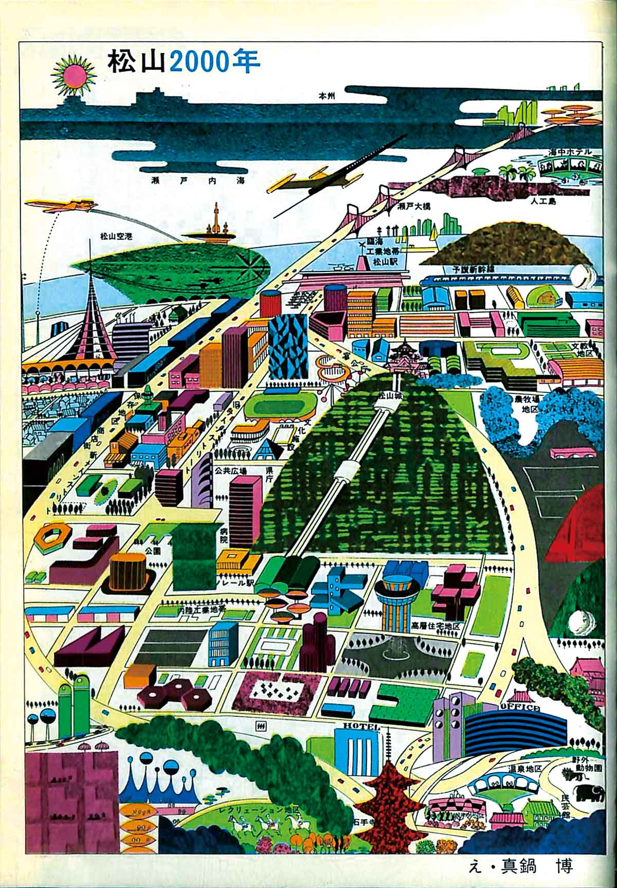 繊細な線と鮮烈な色彩で“空の時代”を表現し、60~70年代の本誌でも未来図を多数発表。愛媛県出身の真鍋さんが松山の30年後を描いた「松山2000年」では、瀬戸大橋で島々が結ばれる未来をいち早く描写しました。