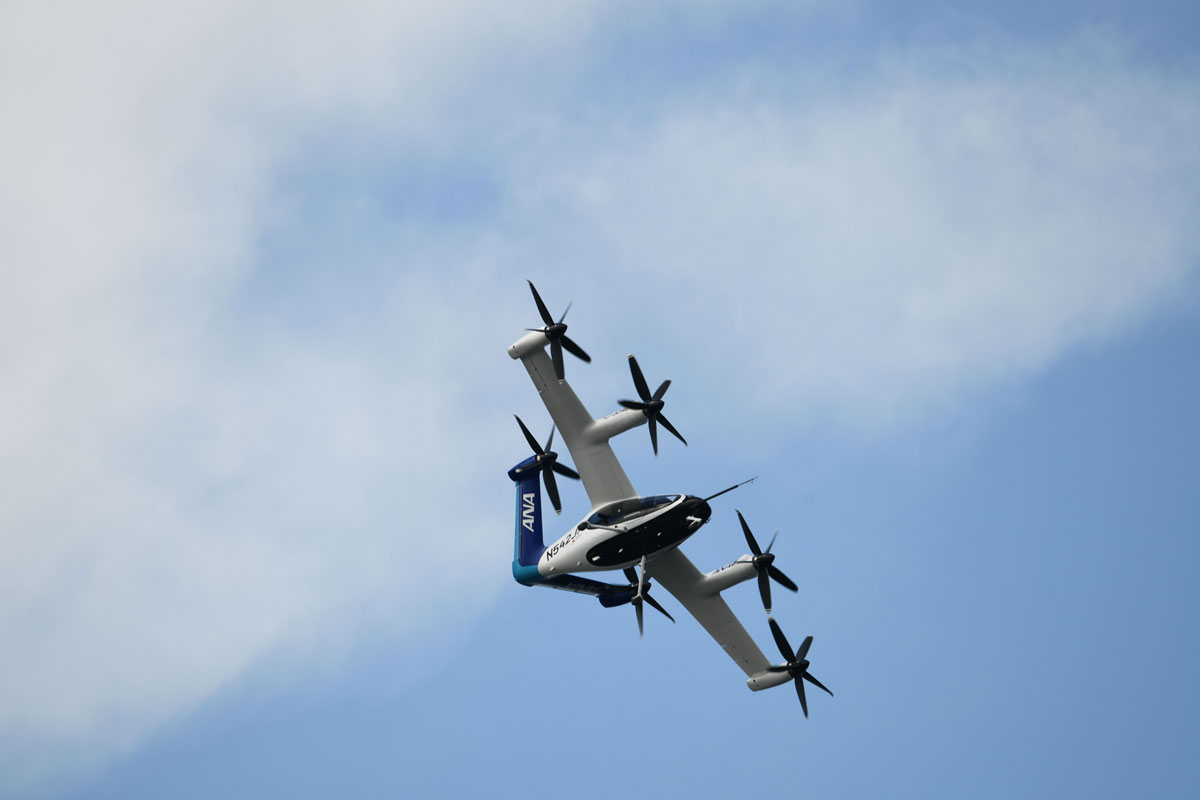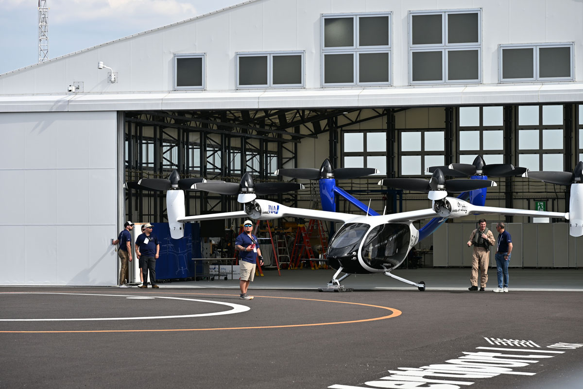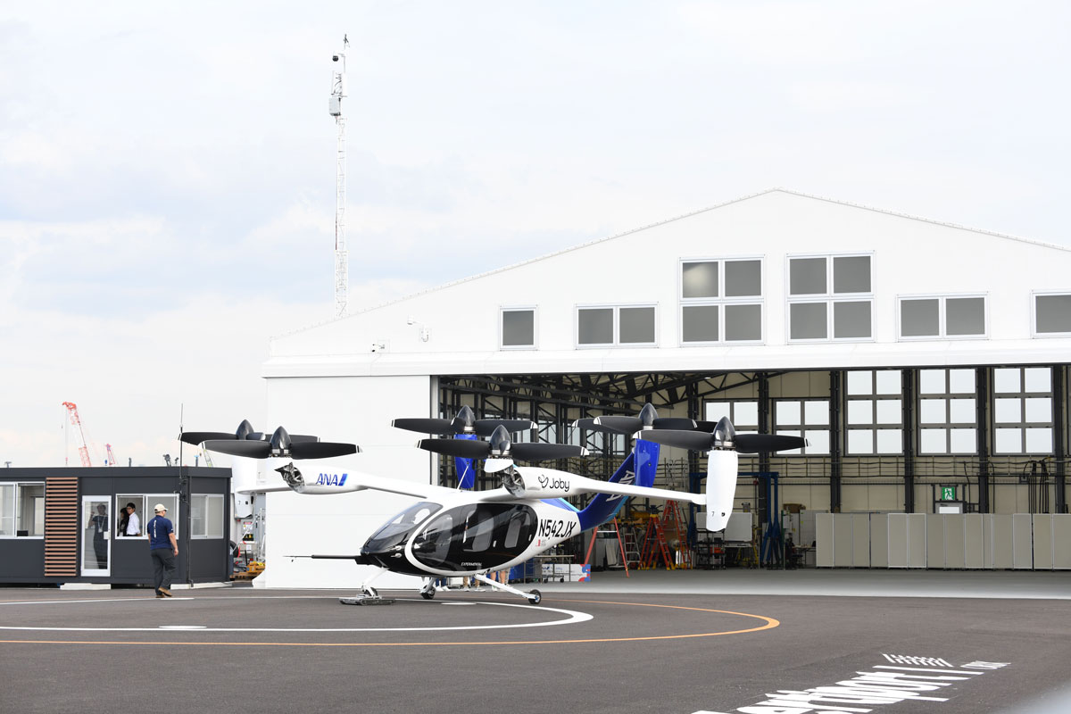 巨大なハンガー(格納庫)の扉が開き、中からゆっくりと機体が現れる。青い尾翼と白い機体にANAとJobyのロゴが鮮やかにデザインされた特別塗装機「Joby S4」は、全長約7.3m、翼幅約10.7mと、セスナ機ほどの大きさだ。