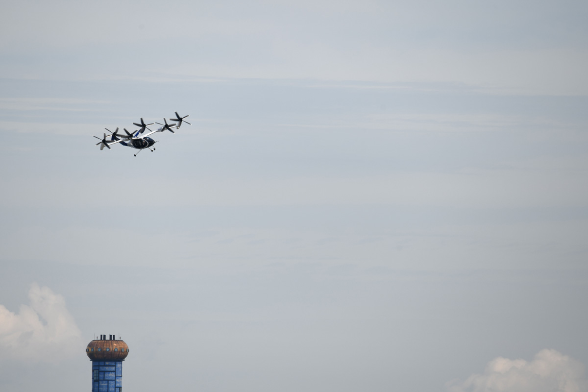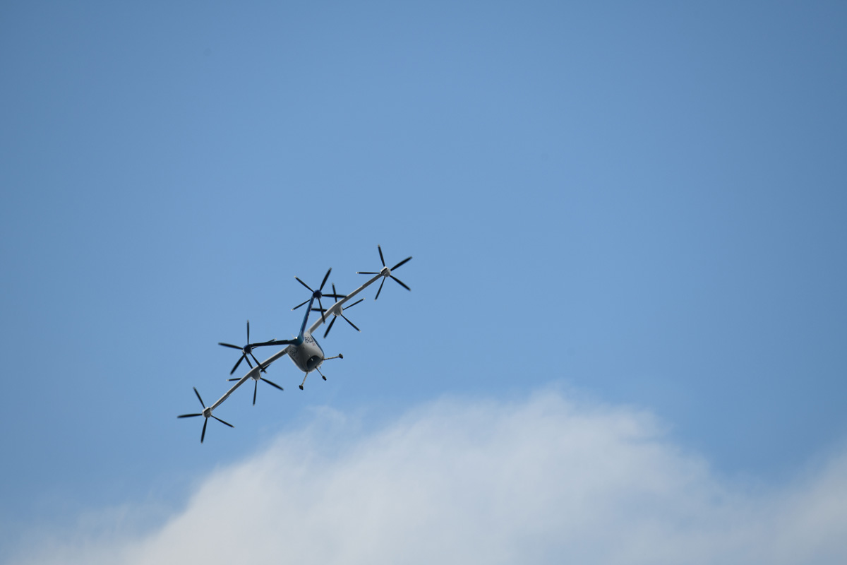 飛び立つ前にまず、プロペラなどの作動の最終チェック。「Joby S4」は、翼に5枚羽根のプロペラ6基を擁しており、プロペラが90度回転できる。