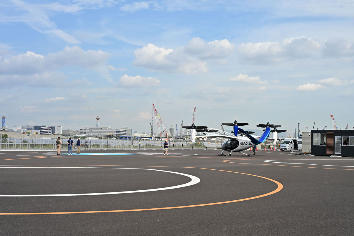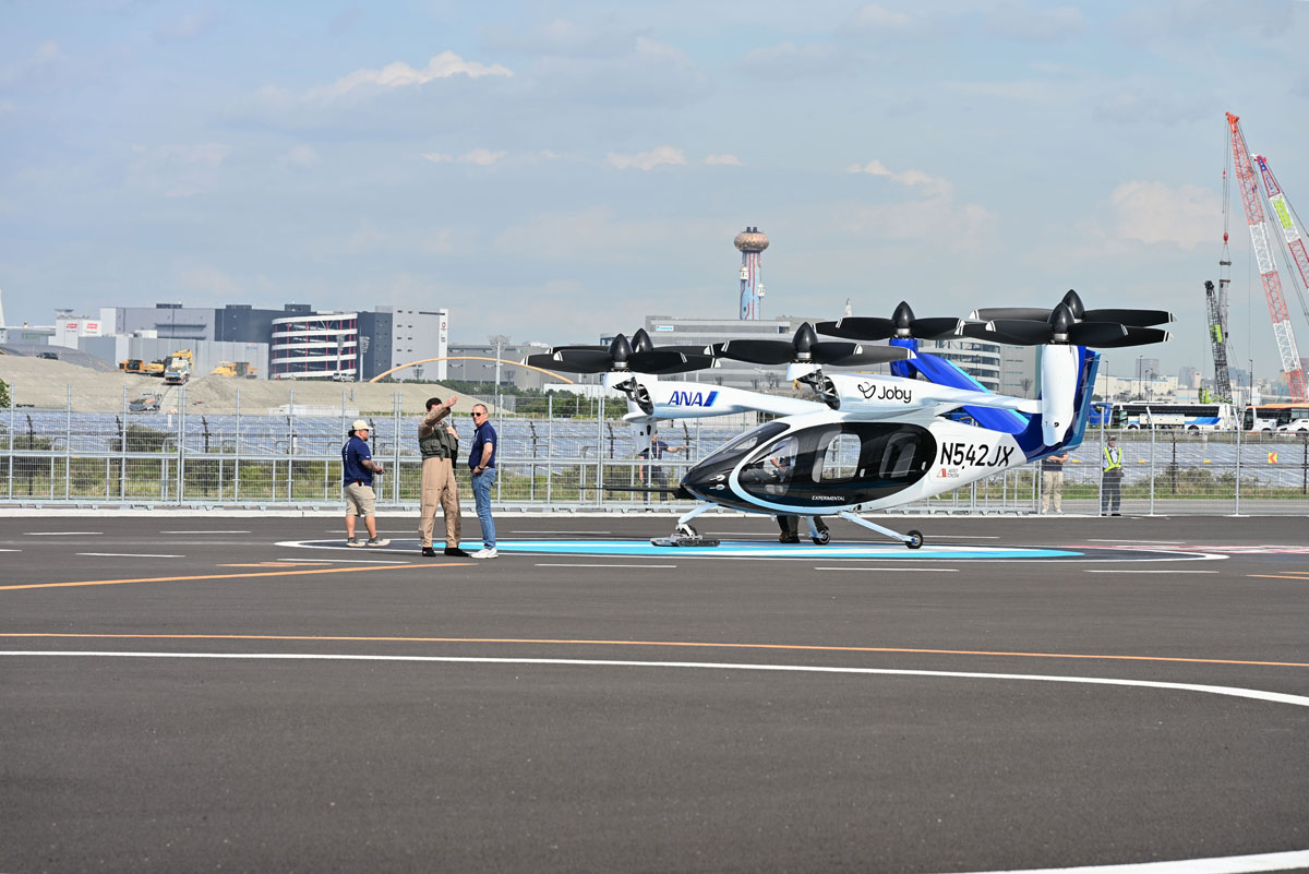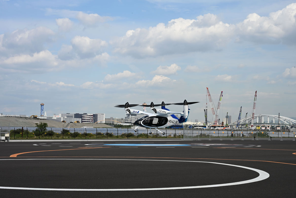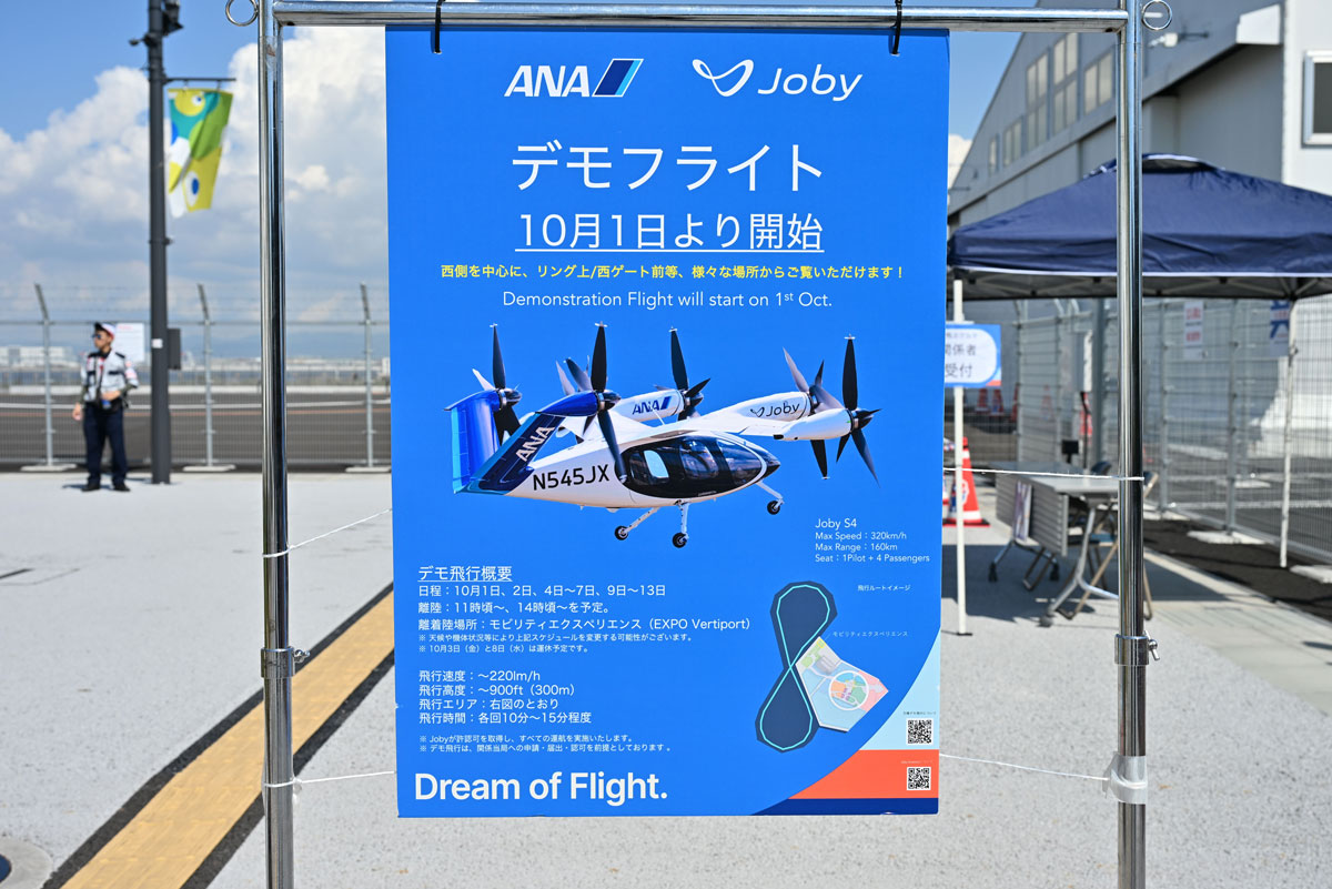 これは、アメリカのJoby Aviation(以下、Joby)が10年以上かけて独自開発し、実用化を目指す次世代エアモビリティ「eVTOL」(電動垂直離着陸機、通称“空飛ぶクルマ”)の最新試験機だ。将来的にアメリカでの安全認証を取得した後、ANAホールディングス(以下、ANAHD)と商用運航できれば、最高時速約320km、航続距離160km、パイロット1名を含む5名を乗せて新幹線と同様の速度で移動できるという、夢のエアタクシーとなる。大阪・関西万博の会場で行われた10月1日と2日のデモフライトの様子をレポートする。