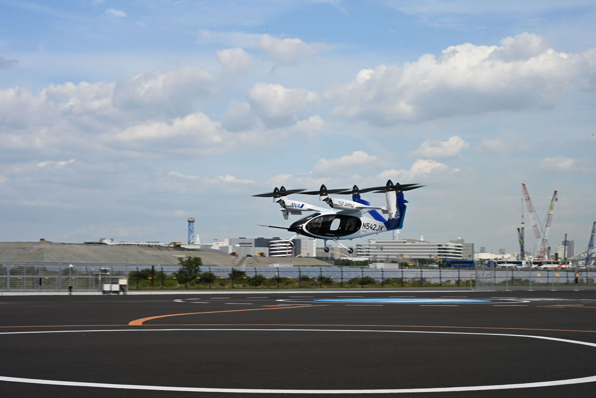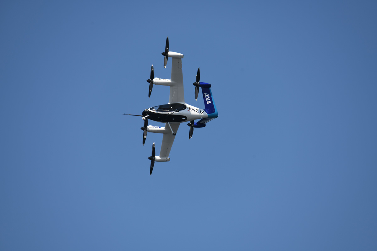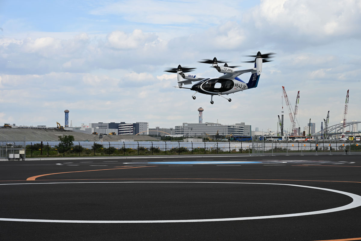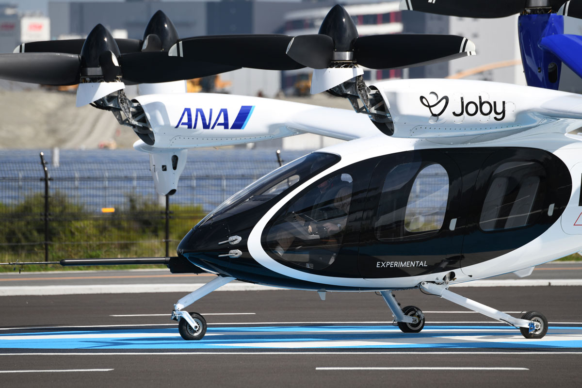 これは、アメリカのJoby Aviation(以下、Joby)が10年以上かけて独自開発し、実用化を目指す次世代エアモビリティ「eVTOL」(電動垂直離着陸機、通称“空飛ぶクルマ”)の最新試験機だ。将来的にアメリカでの安全認証を取得した後、ANAホールディングス(以下、ANAHD)と商用運航できれば、最高時速約320km、航続距離160km、パイロット1名を含む5名を乗せて新幹線と同様の速度で移動できるという、夢のエアタクシーとなる。大阪・関西万博の会場で行われた10月1日と2日のデモフライトの様子をレポートする。