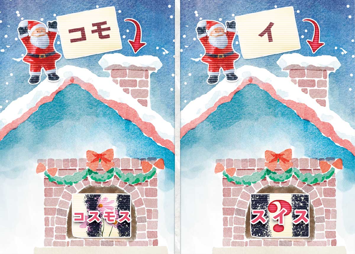 紙が汚れていない部分には元々書かれていた文字を、汚れている部分には「スス」を当てはめて、紙を読んでいこう。すると左側の紙はたしかに「コスモス」と読むことができるね。同じように考えれば、ハテナに入るのは「スイス」だとわかる。正解は「スイス」だ。