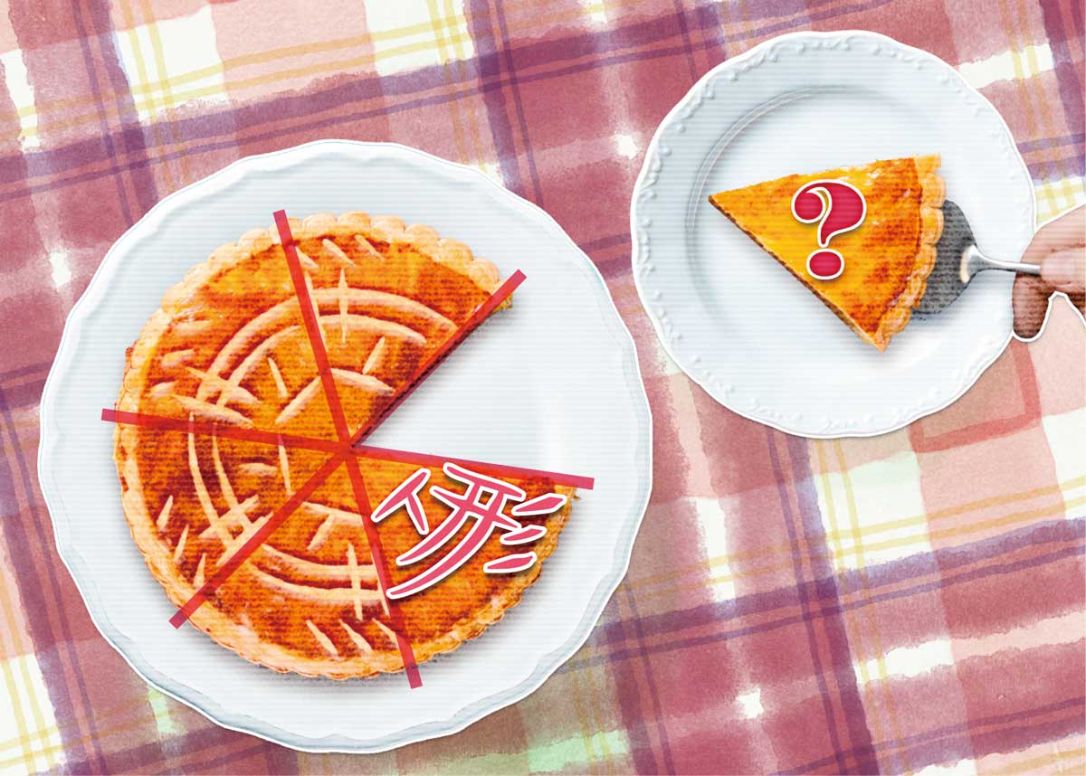 残っているケーキにかかれている模様から、切り取られたケーキの模様を推測しよう。すると「人形」とかかれていたと考えられるはず。正解は「人形」だ。