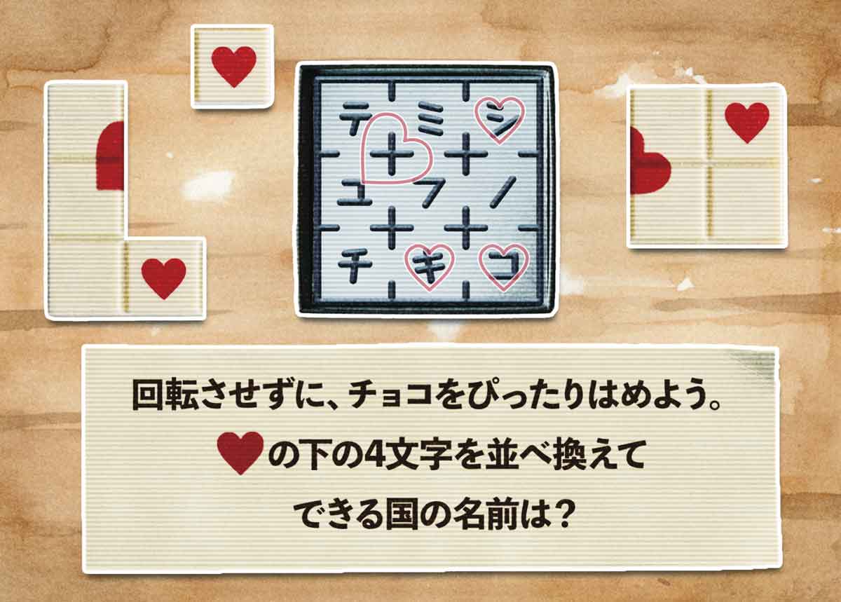 4つのチョコを重ねると、ハートの位置は図のようになり、文字に重なっているのは「シ」、「キ」、「コ」の3文字だ。マスの隙間に重なっているものは、ハートを正しい向きにすると「メ」と読むことができる。この4文字を並べ換えてできる国は「メキシコ」だ。