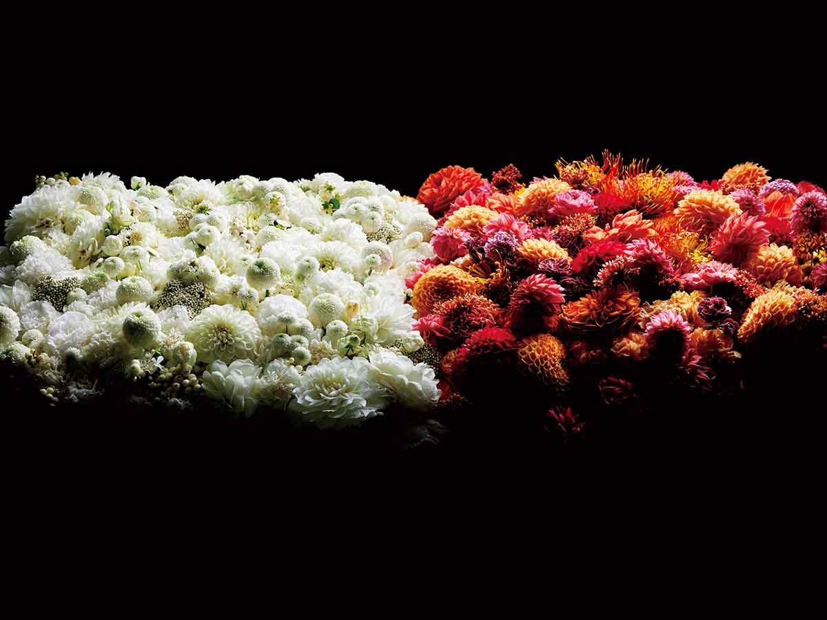 今月はダリアをメインに紅白の装花を作りました。新年を寿(ことほ)ぎつつ、あの、ビフカツの赤身と脂身を思い出しながら。