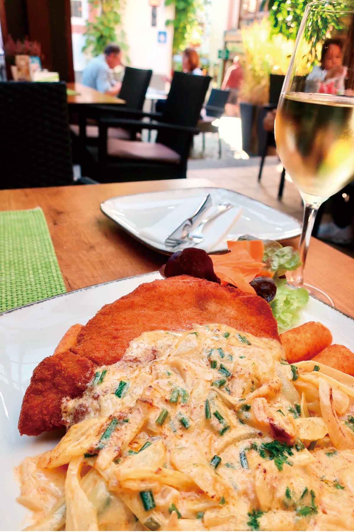 やや甘口の地元ワインとオニオンソースのシュニッツェルの最高の組み合わせをレストランのテラス席で楽しむのが、おすすめの過ごし方です。食後には、響き渡るからくり時計の音を聴きながら、石畳の街の散策も楽しんでみてください。