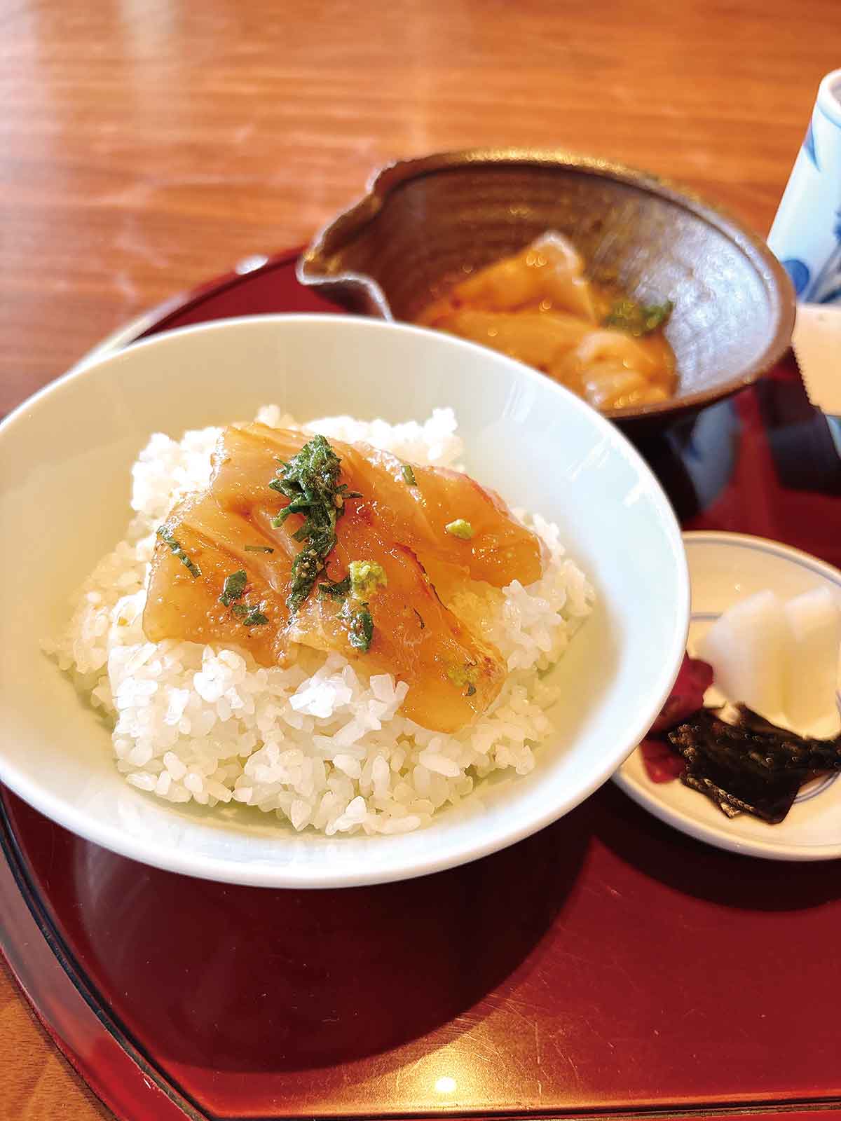 県内ではさまざまなお店でいただくことができますが、私のおすすめは、松山市内の「ANAクラウンプラザホテル松山」内にある『日本料理雲海』の鯛めし。ここでは宇和島風「醤油だれ」と雲海特製「胡麻だれ」の2種類のつけだれから味を選ぶことができ、特にこちらでしか食べられない胡麻だれがイチオシです。