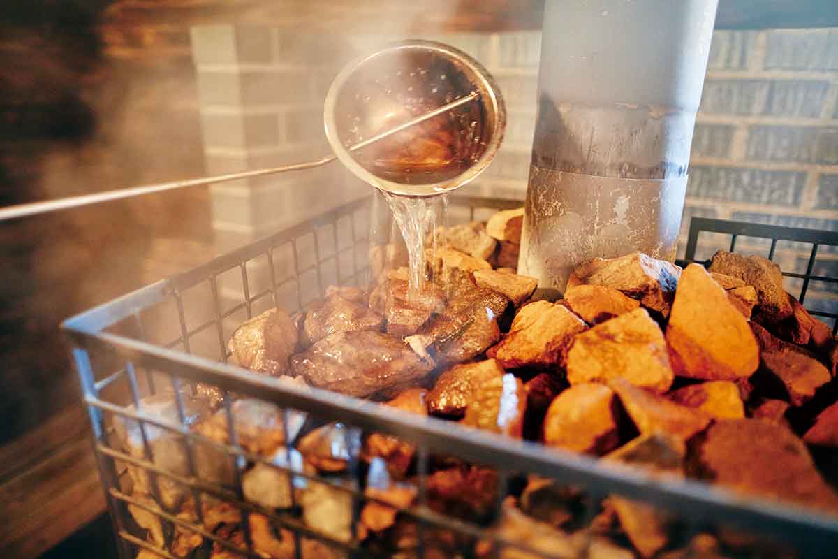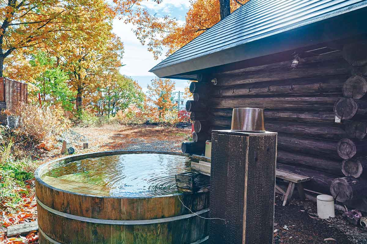 薪やストーブ、ヴィヒタには地元の素材をふんだんに使用。水風呂から上空を見上げると、高い木々が包み込んでくれる。浅間山の湧水は飲み放題。薪サウナと水、外気が浄化してくれる。