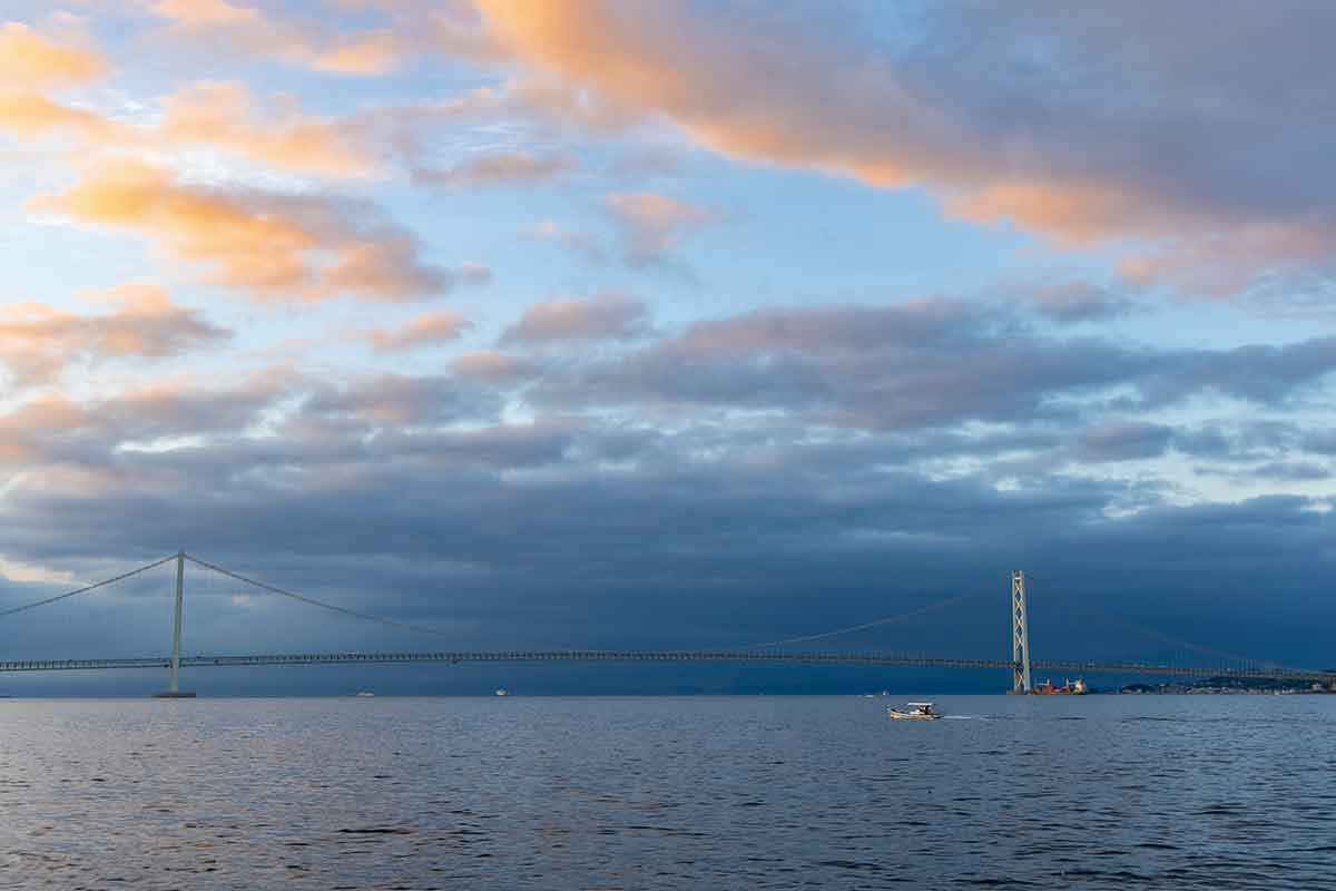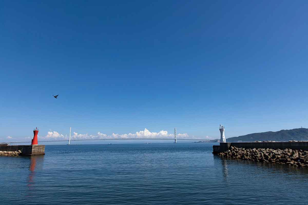 兵庫県神戸市と淡路島を結ぶ明石海峡大橋。大阪湾と播磨灘をつなぐ明石海峡の幅は約4 km、水深は約110m、潮流は最速で毎秒4.5m に達する。「鹿ノ背」と呼ばれる砂地の浅瀬もあり、多様な生き物が棲む豊かな漁場を形成している。