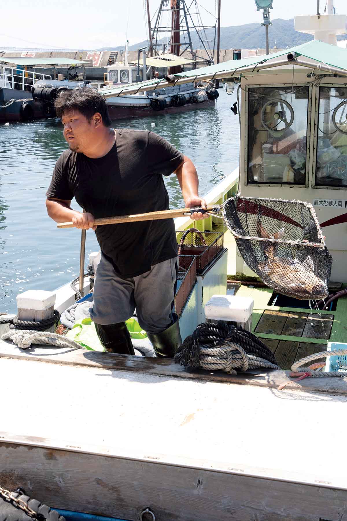 港に戻ってきた漁船から水揚げされる魚。タモの中には大きな真鯛が跳ねていた。