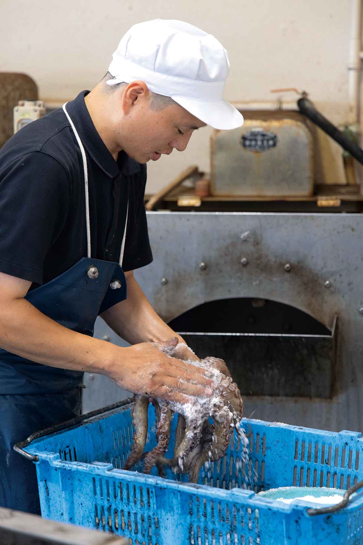 墨を取り除いた蛸に一匹ずつ、蛸の中心部にあるカラス口(蛸の口)の周りの、もっとも肉厚な部分から手で塩を揉み込んでいく。使用するのは和歌山県産の粉砕天日塩。不均一な粒は塩揉みの際に全身にムラなく塩を行き渡らせるのに効果的。水は硬度800 のミネラル豊富な地下水を使用。