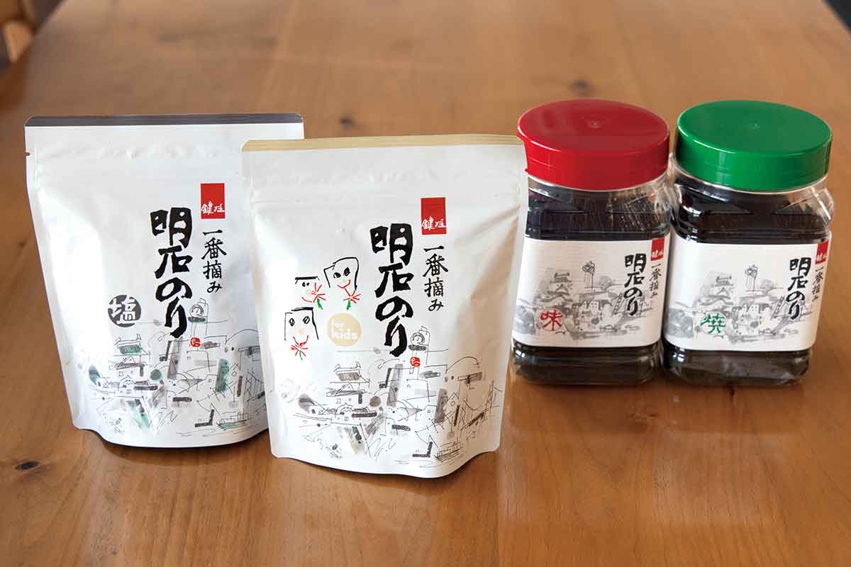1977年創業の「鍵庄」は、明石海峡の“一番摘み”の海苔だけを使用した商品づくりを行い、色艶や口溶けのよさ、芳醇な香りなど明石海苔の魅力を伝えている。また、アレルゲンのない味付け、約15ミクロンに粉砕した海苔を練り込んだ素麺や菓子の開発など、現代の生活に寄り添い海苔の可能性を広げている。