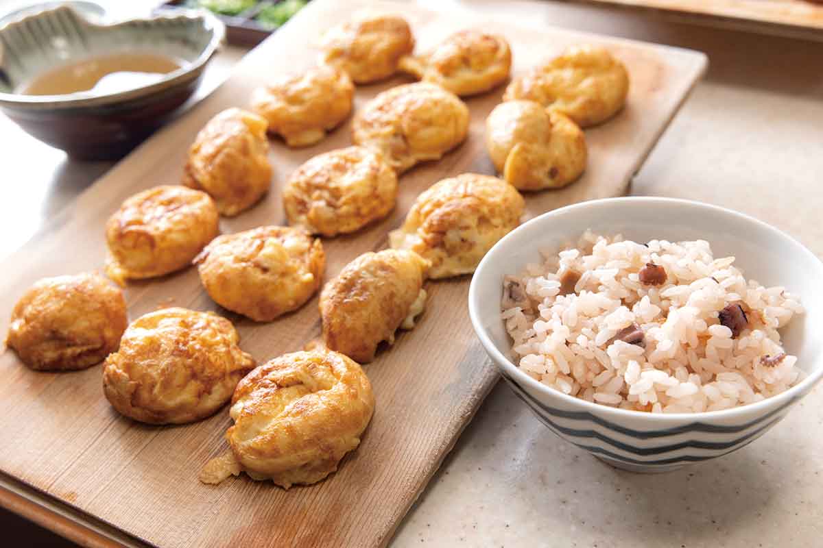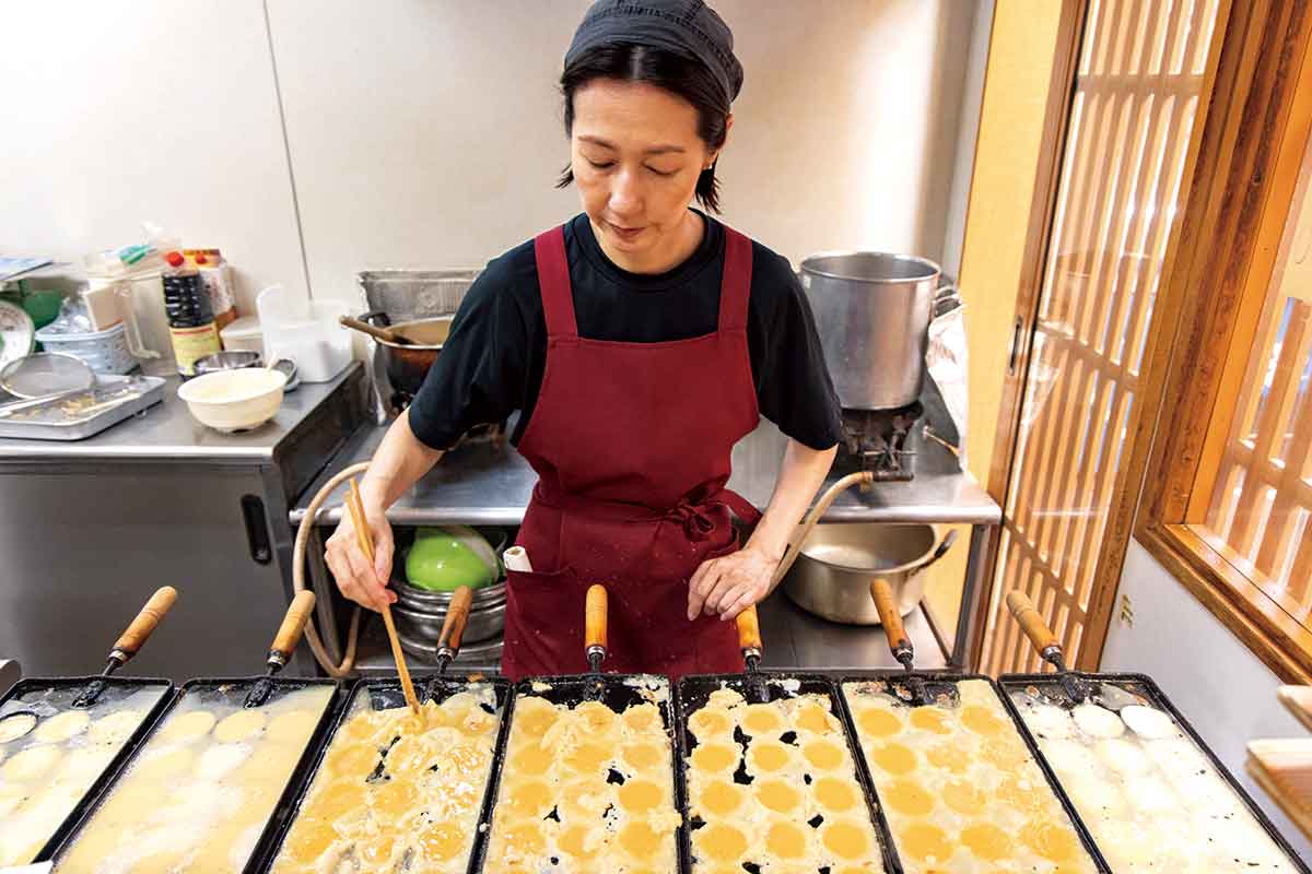 魚の棚には「明石焼」の店も多く、昼時ともなれば地元の人々に観光客も加わり行列ができる店も。明石では玉子焼と呼ばれ、玉子、小麦粉、じん粉(小麦粉のでんぷんを精製したもの)を使うふわふわの食感とだし汁につけて食べるのが特徴。店ごとに味わいが異なり地元っ子にはそれぞれ贔屓の店があるそうだ。