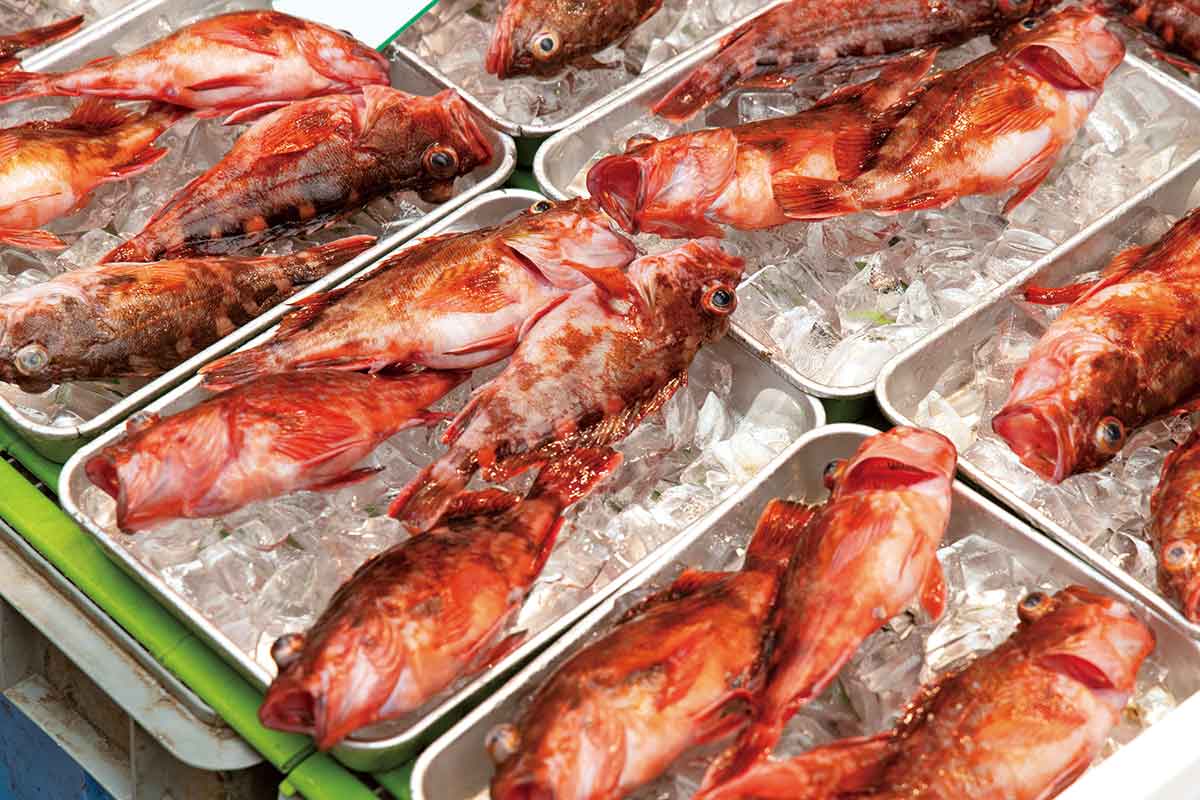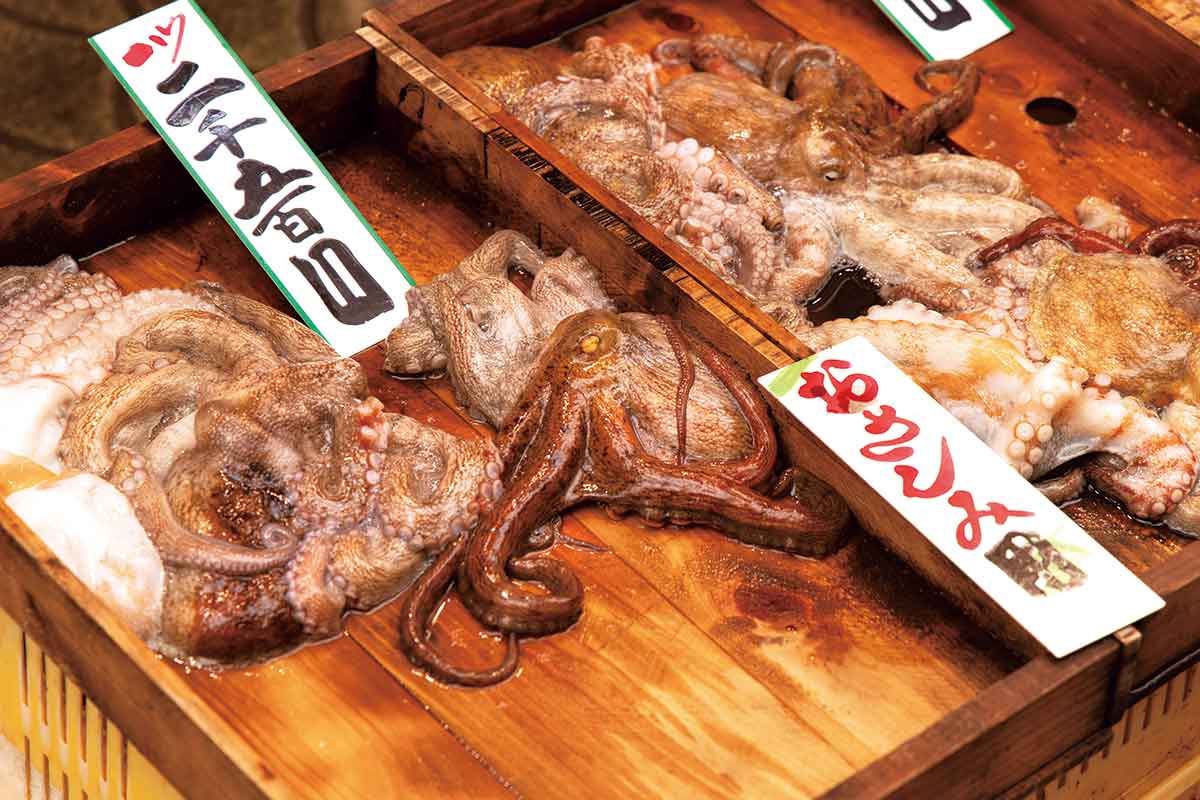 競りが終わる昼過ぎ頃には、魚の棚商店街の鮮魚店に魚が並ぶ。左はカサゴ、右は真蛸。