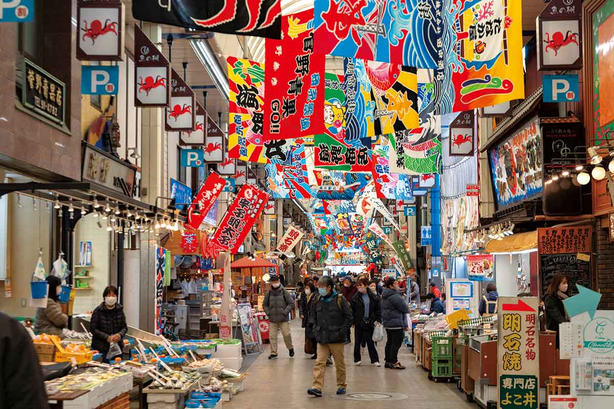 港から徒歩10分 潮風に大漁旗がはためく商店街に明石の恵みが詰まってる