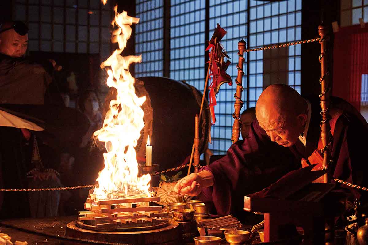 大岩山最勝寺では節分の法要が一年で最大の行事。ここでは「福は内」のみを唱え、鬼を追い出さない。各地で行き場を失った鬼を迎え入れ、毘沙門天の前で改心させ、福を運ぶ“福鬼”として送り出すためだ。毘沙門天は七福神随一の福徳を持つともされ、恵みを託された福鬼は、人々のもとへ福を届けに向かう。