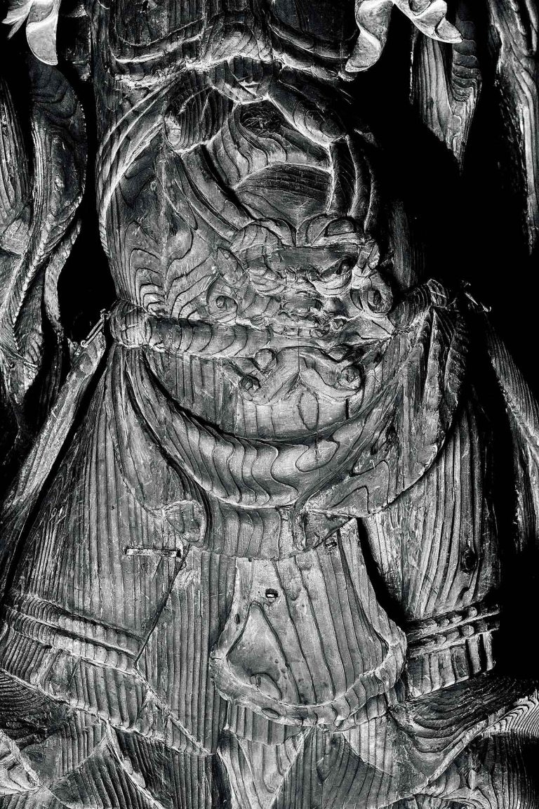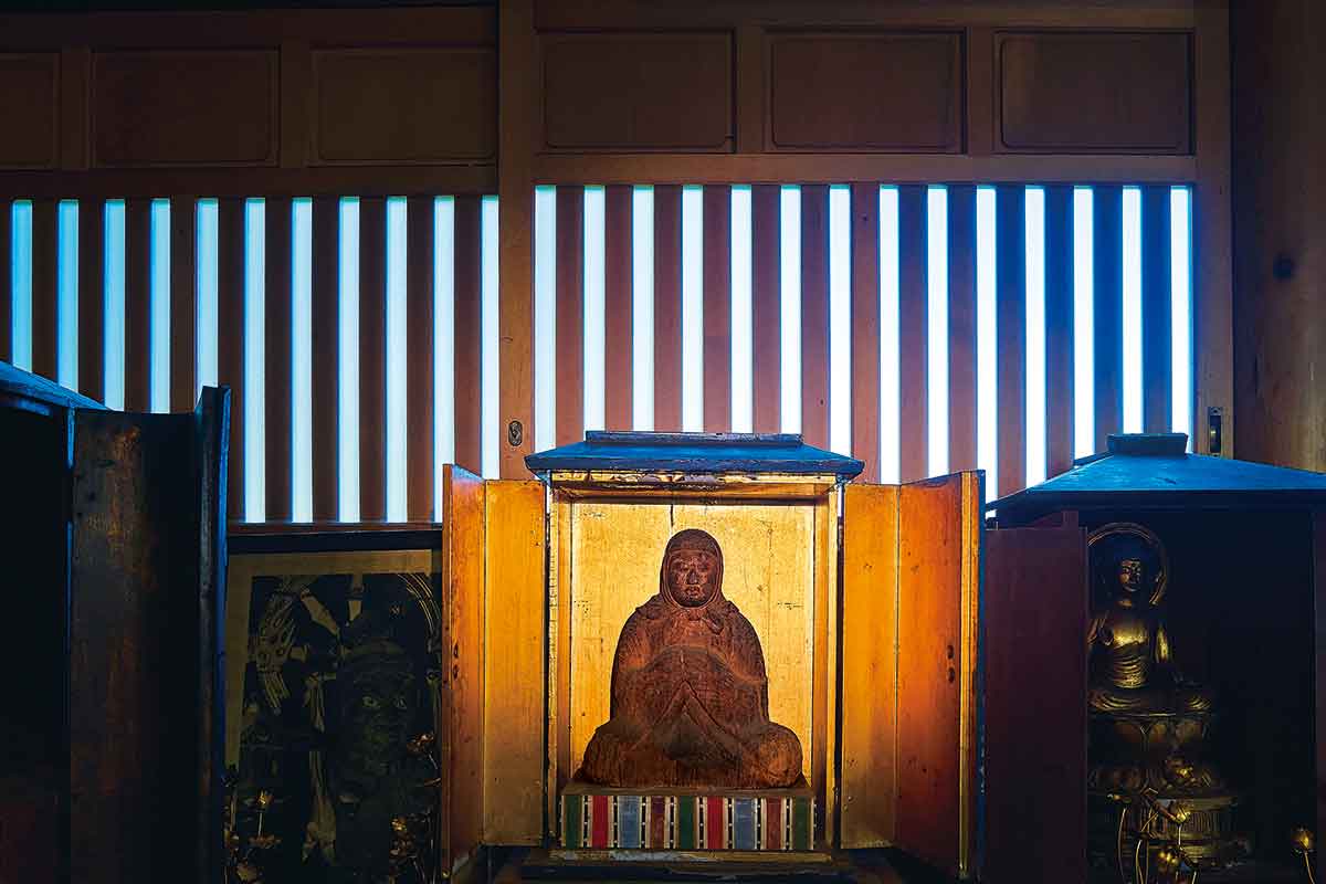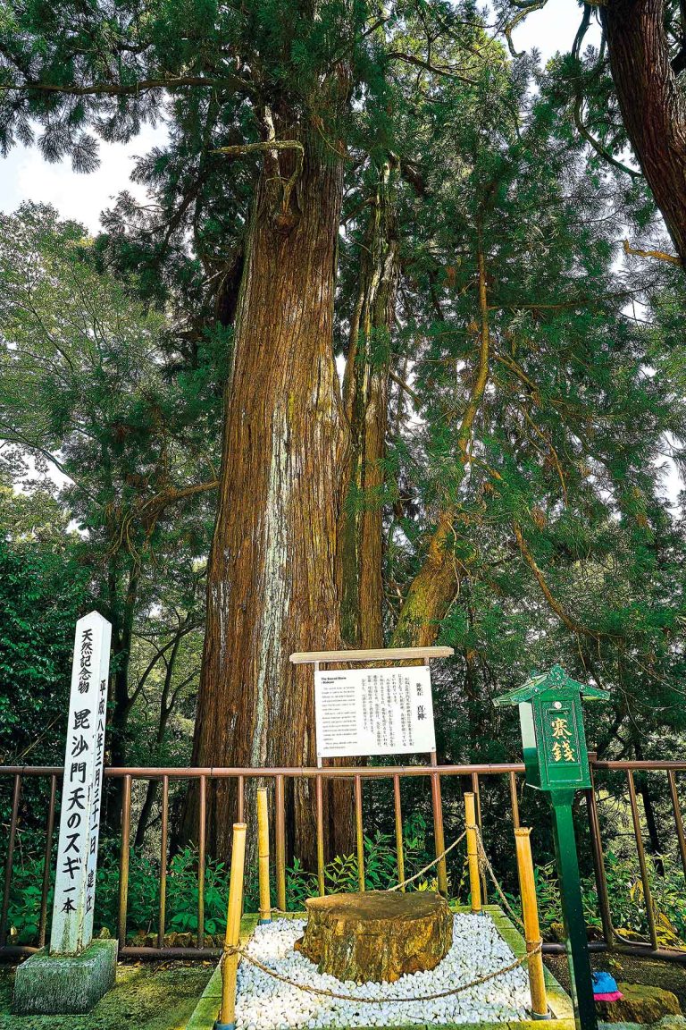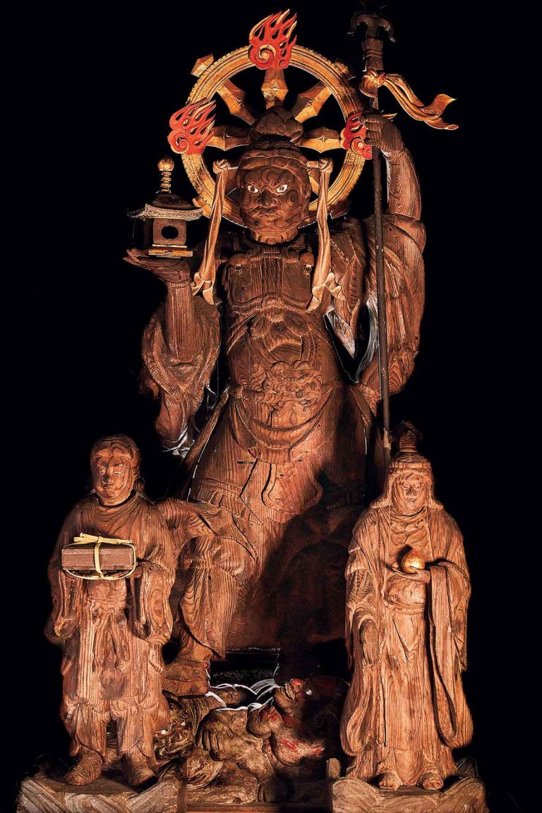 山火事の際、毘沙門天像は町の人々の協力で避難。火は食い止められたものの、江戸時代に彫られた像の傷みは激しく、京都の国宝修理所で3年かけて修復された。その過程で、仏像には珍しい杉材が使われ、“うづくり”や“焦がし”の技法により顔の表情や衣服の質感まで木目で巧みに表現されていることが判明。修復には寺の御神木の杉が用いられ、毘沙門天、妃の吉祥天の善膩師童子の3体がいきいきと甦った。