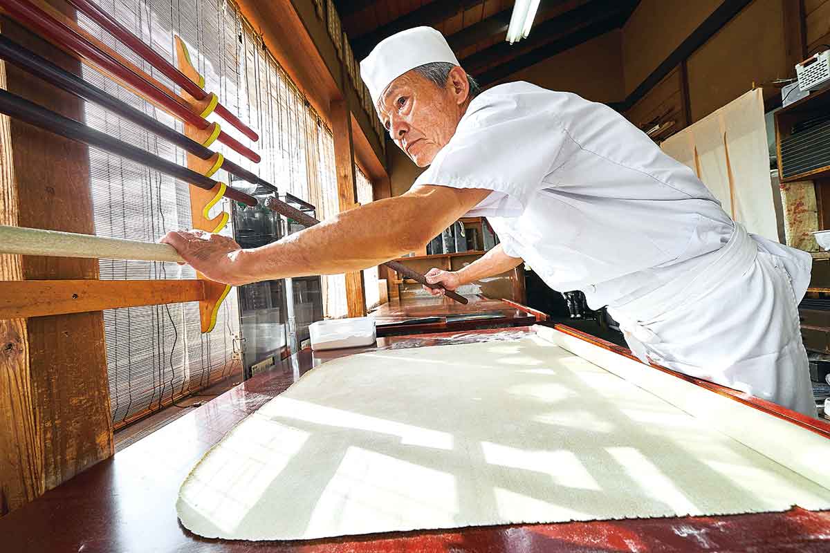 足利の街並みを見渡す織姫山の中腹に建つ「蕎遊庵」。江戸前ならではのつるりとした食感の打ち立て蕎麦や、季節の変わり蕎麦が楽しめる。名物の“さらしな生一本”は、太さ0.5ミリの細麺を1~2秒でさっと湯がく繊細な蕎麦。根本さん曰く「熱や乾燥にとても敏感で、ほんのわずかな違いで切れてしまう」ため、提供する店は全国でもごくわずか。蕎麦打ち教室は予約制。