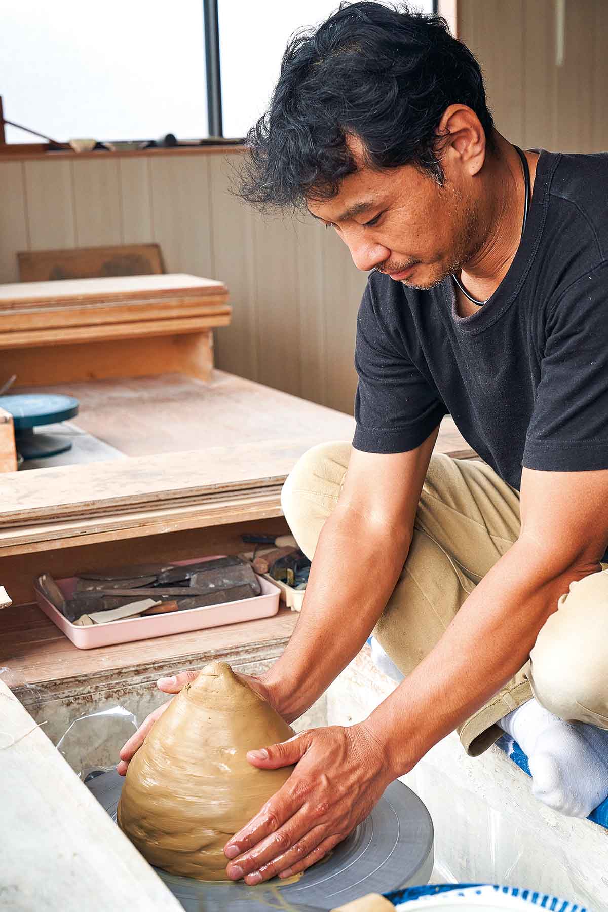 1982年、足利市生まれ。専門学校を卒業後、家具修理の仕事に携わるなかで“ものづくり”への思いを深め、人の勧めを受けて京都の陶工訓練校で学び、村田森氏に師事。2012年に独立し、地元へ戻って作陶の道を歩み続けている。やわらかな質感と温もりを宿した器は、和洋中いずれの料理も美しく引き立てるとしてプロの料理人からの信頼も厚い。