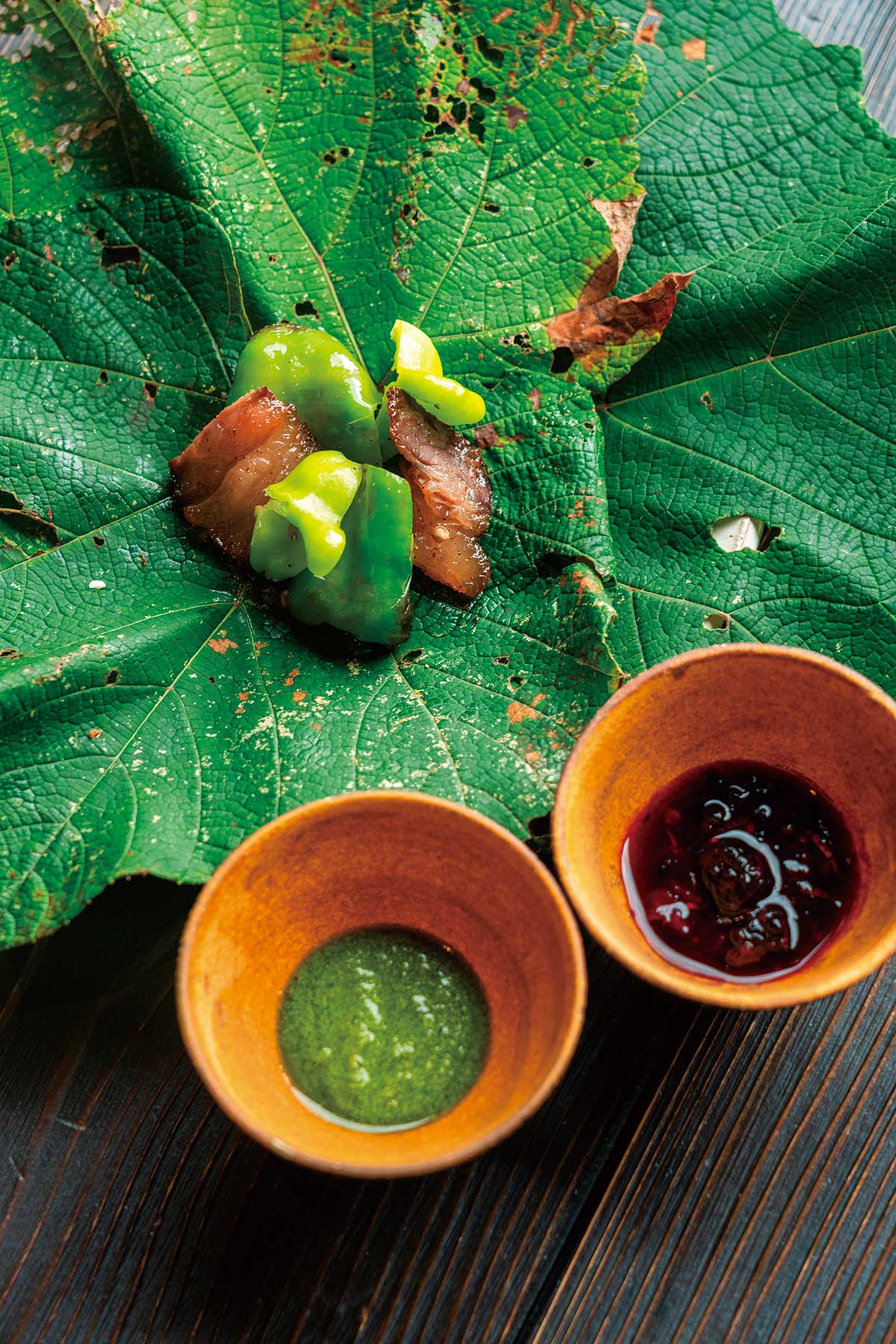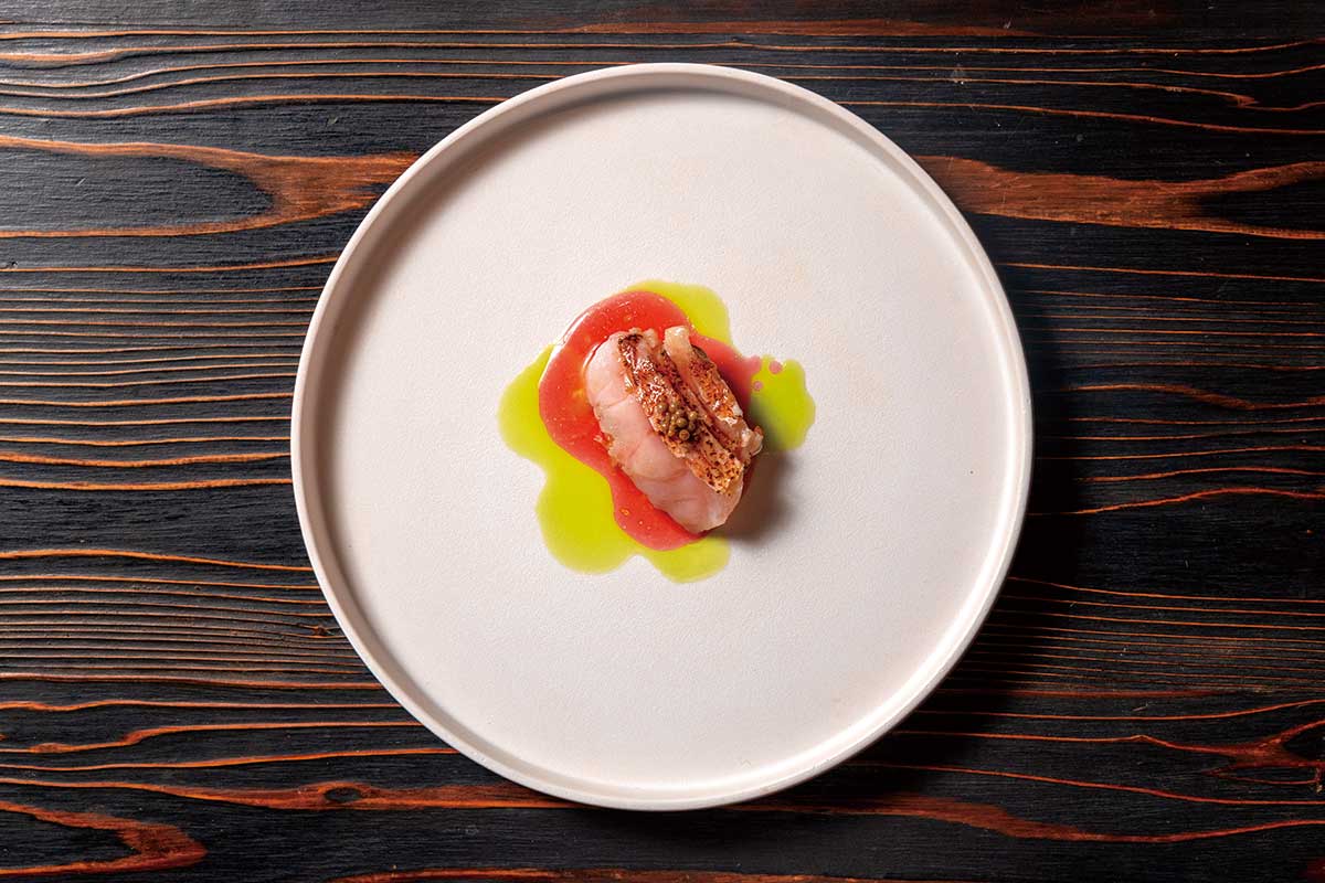 万願寺とうがらしと合わせた牛のベーコンも手作り。ソースは摘みたてのベリーとハッカ。甘鯛は佐渡産。生のまま食べられるなすは驚くほど甘い。
