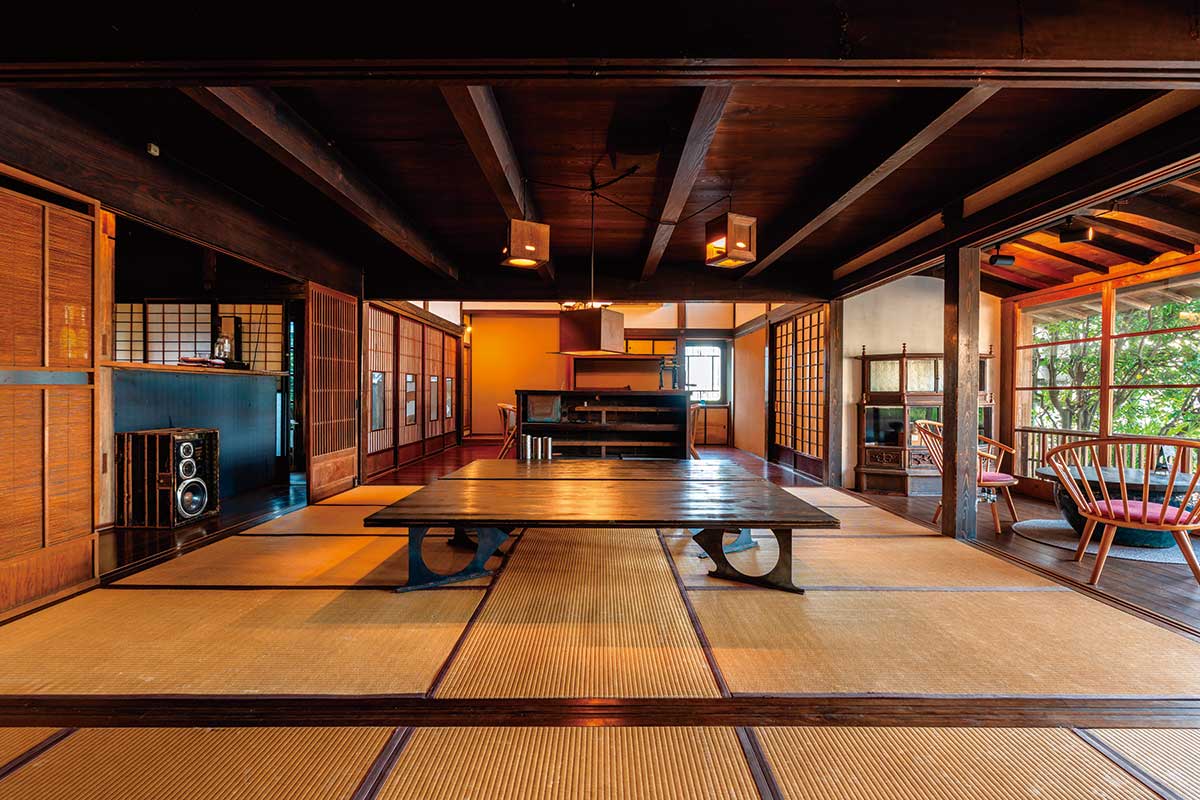 レセプション棟は、貴重な総欅・総漆塗り。高さ10 メートルの吹き抜けは圧巻。一棟貸しも設え、6棟の古民家をリノベーションしている。サウナ付きの棟も人気。オーナーは雑誌『自遊人』の編集長でクリエイティブ・ディレクターの岩佐十良氏。