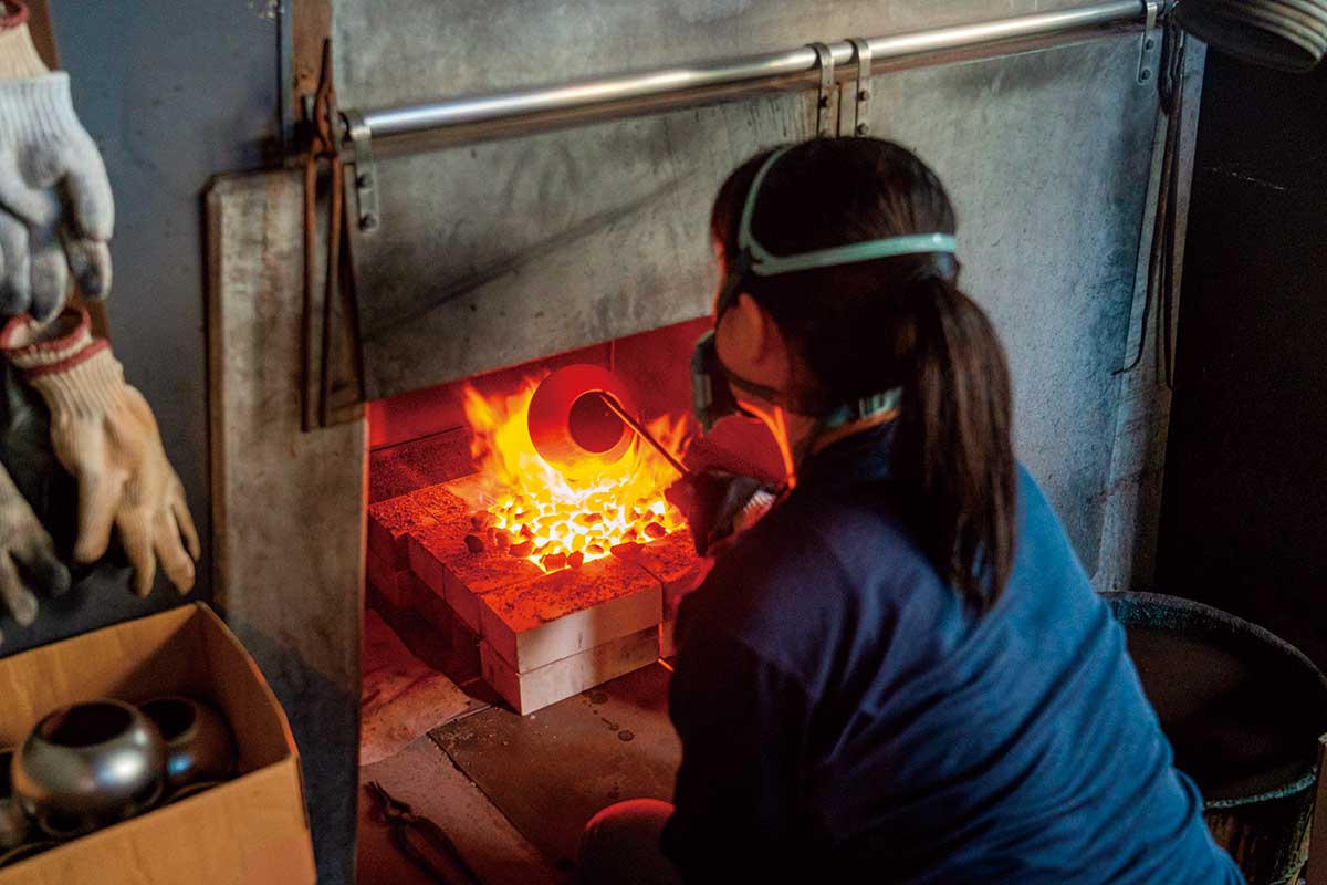 銅を叩いて伸ばすのではなく、叩きながら縮めていく手法。縮めるのも丸めるのも職人の勘一つ。一度叩くと銅は硬くなるので、製作途中に火炉の中に銅器を入れ柔らかくする。最後に玉川堂独自の着色を施す。