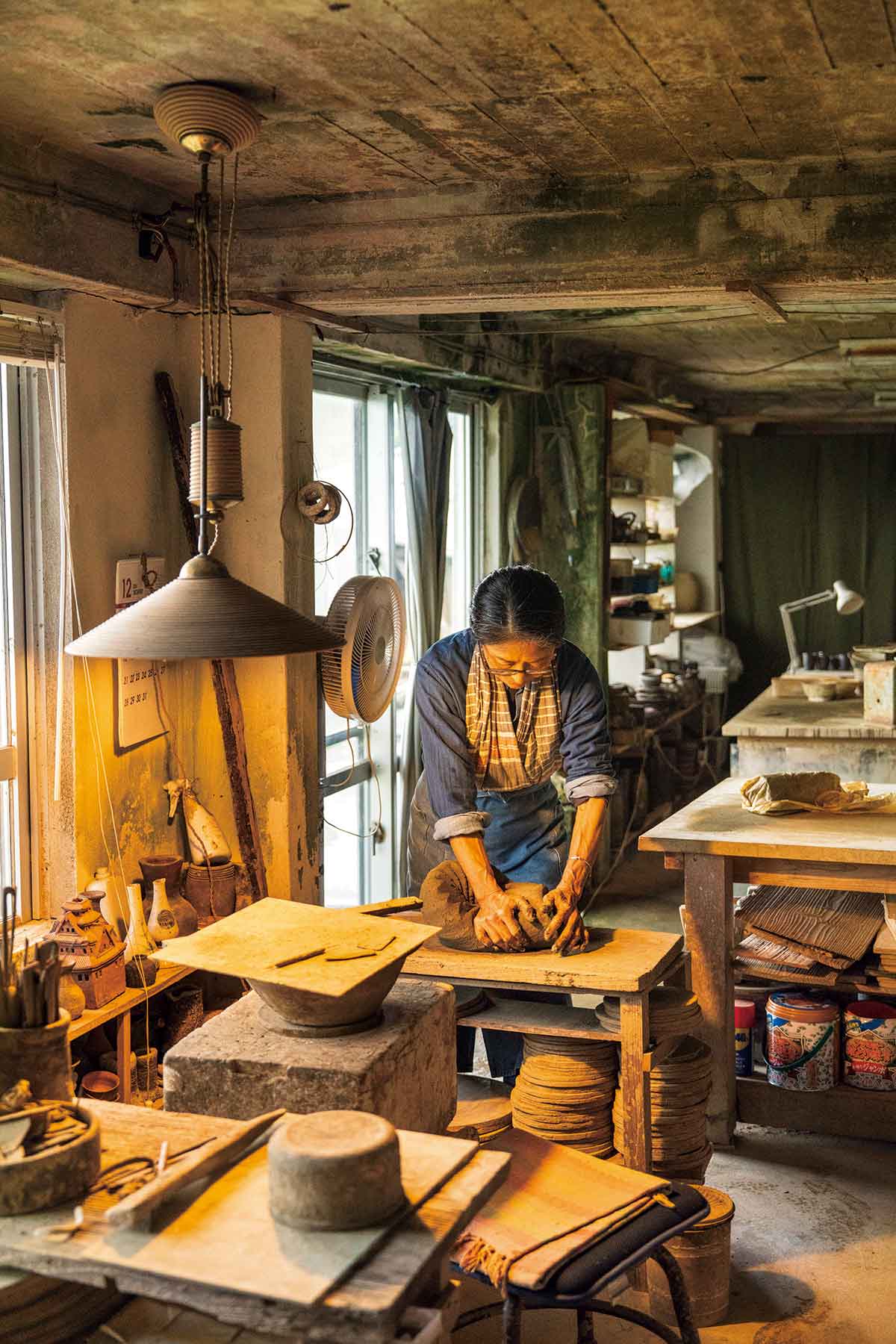 鶏舎だった建物を利用した工房。北欧のヴィンテージ家具や照明と其飯さん手作りの台などが混在する。週に5日はここで作業をしている。水は湧き水を使用。
