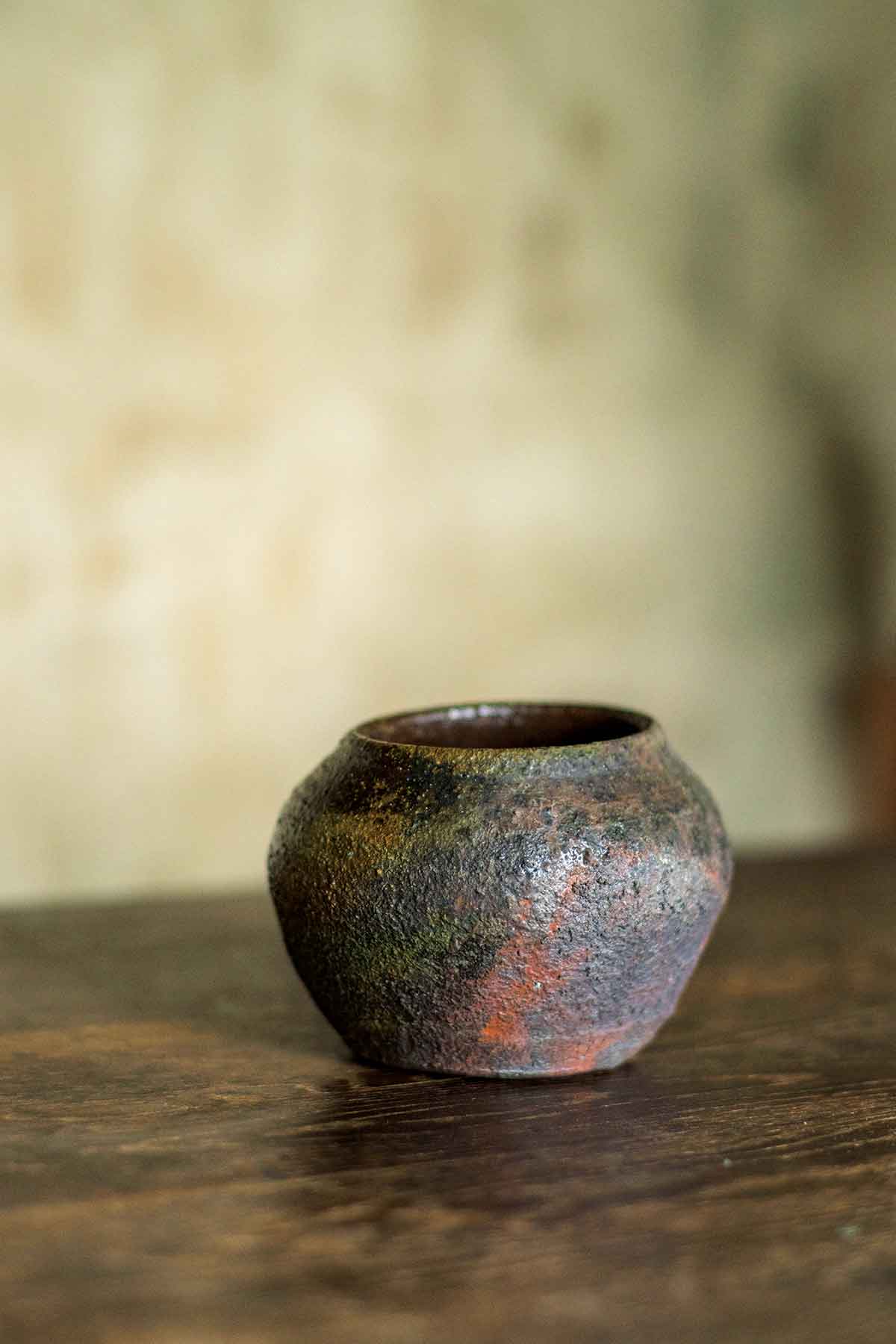 寄り添い理解すれば“土殺し”※という乱暴な行為に抵抗を感じるようになった。しかし、土の粘性を引き出すこのプロセスを省く作陶は容易ではなかった。轆轤(ろくろ)の回転を下げて指の感覚に集中し、土の成りたい形へ。成形時に土に無理を与えなければ、炎に負けず見事な色彩を奏でてくれる。この土の底の見えない潜在力の高さに驚かされる。「現状受容」という禅のコトバがある。なるだけ私を排除して土の向かう方向へほんの少し手を加える、それが更にこの土の魅力を引き出す手立てだと語ってくれた。