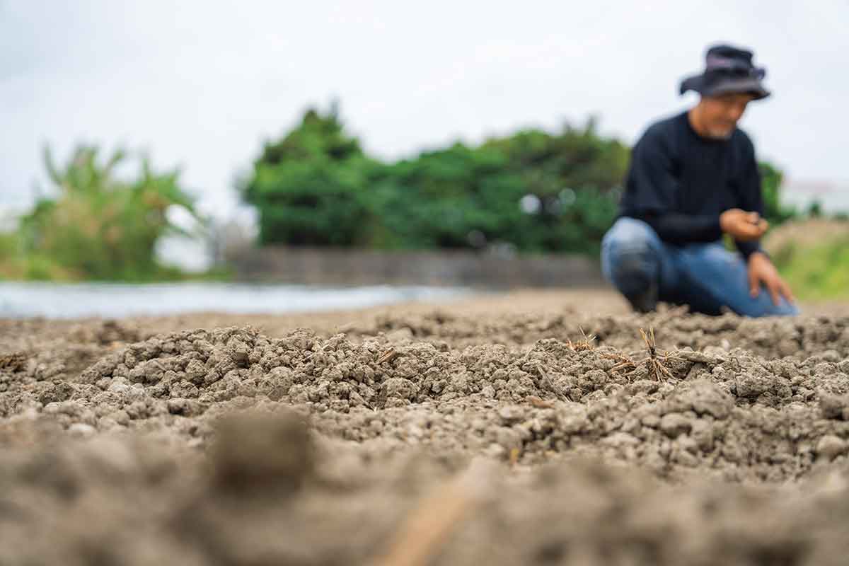 ジャーガルという粘土質の土で、石のように硬い塊や雨後の粘度に悩まされながら試行錯誤。緑肥を作り、土に有機物を入れて柔らかくする農法を取り入れ、沖縄ではあまり見かけない野菜を中心に年間10種類ほどを栽培する。今後は種類を増やしていく予定だ。
