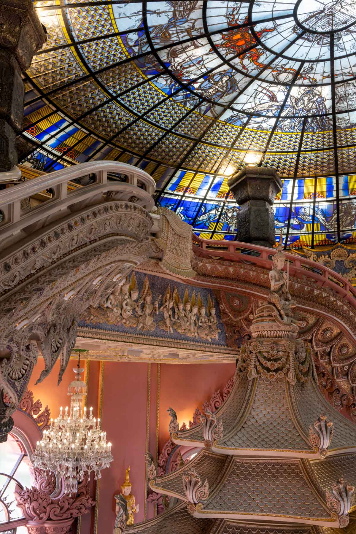 その象徴が、サムットプラカーンにそびえるエラワン博物館。三つ頭の巨大な象の下に広がる内部空間は、壮麗な階段とステンドグラスの天井が織りなす“祈りの光”に満ちている。