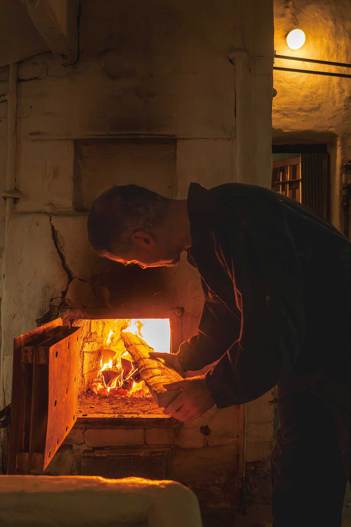 古来のサウナの特徴は、一度焚いたら一日中蓄熱可能なストーブ。薪をくべるのは熟練のアレクサンデル・レンブケさん。長い薪木を5時間に及び焚き、1トン以上のストーンが熱される。オープン時は鋭く熱いロウリュ、次第に柔らかで潤ったロウリュが噴き出て、その変化も心地よい。