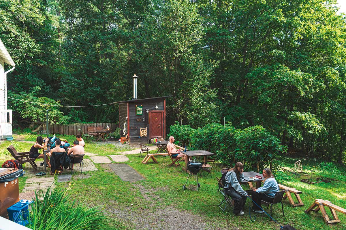 庭の別棟には薪サウナ。みんなで入ったり、個々で入ることもあるそう。