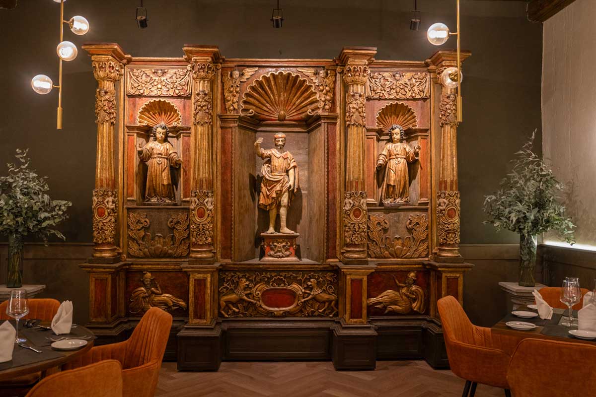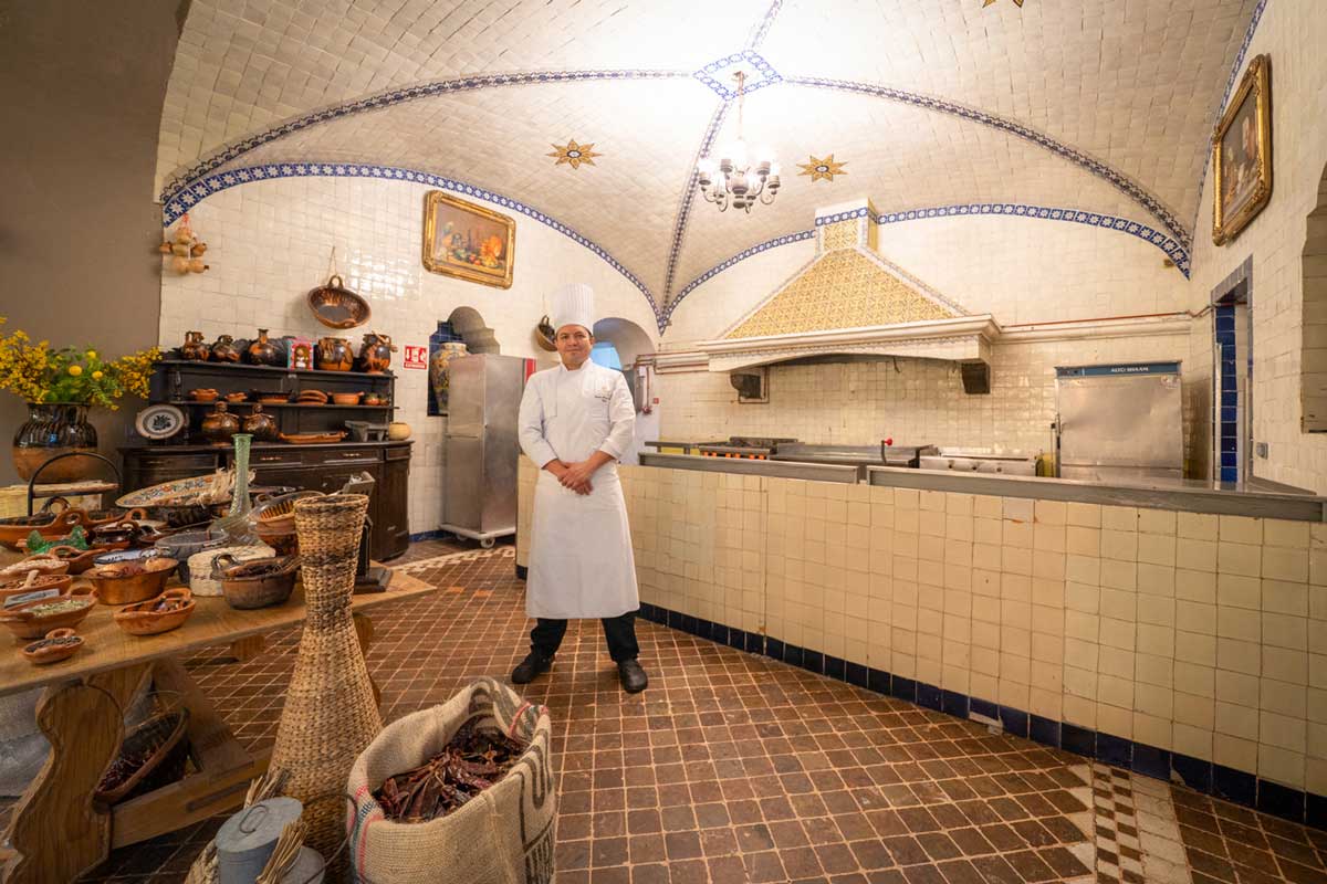 ホテル内にあるレストラン「Tierra Mia(ティエラ・ミーア)」も圧巻。プエブラの伝統料理をベースにしたインターナショナルな一皿を、修道院時代から残る壮麗な装飾品に彩られた空間でいただくことができる。