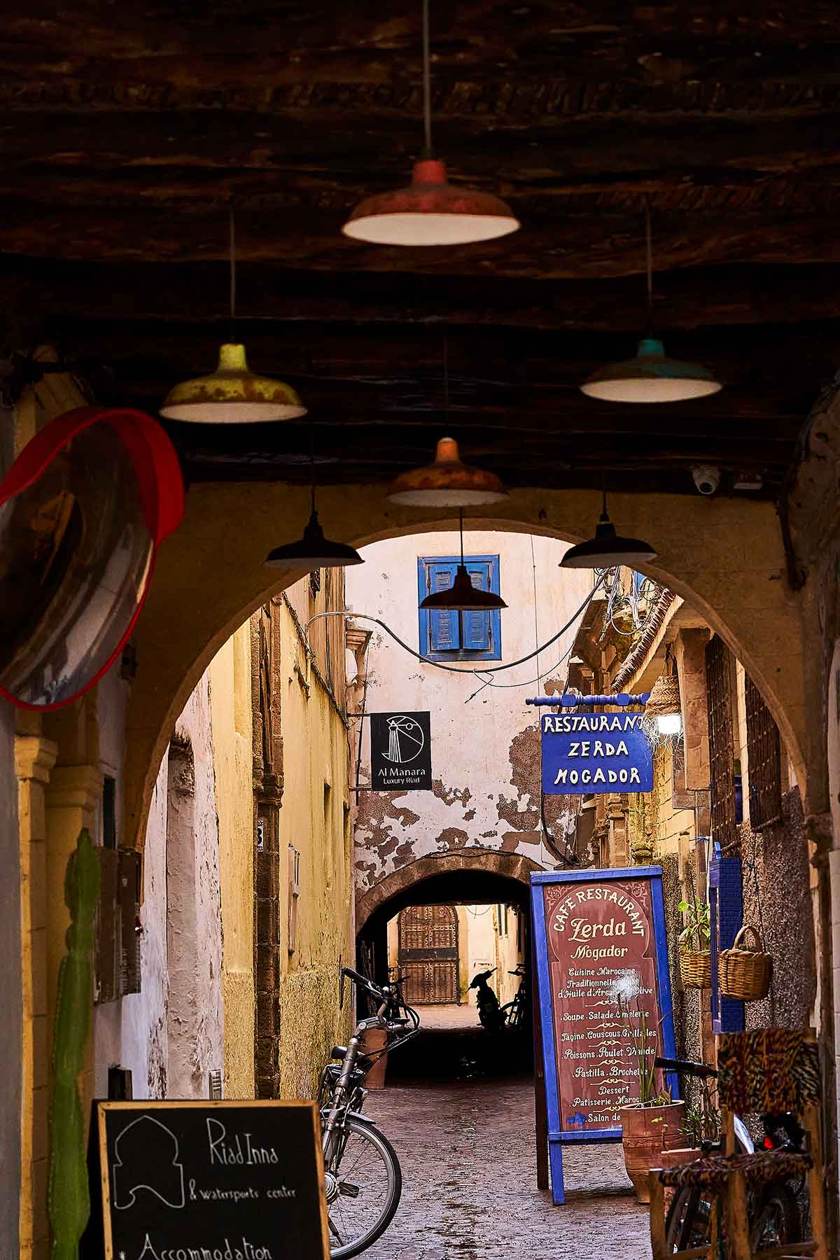メディナの中に泊まるなら、多くの場合、宿はリアドという選択となる。リアドとはかつての邸宅を宿泊施設にした、そんなスタイルの宿のこと。中庭を囲むように部屋が並び、タイルの装飾が光を受けて静かに輝く。アーチ型の窓が風を招き入れ、外の喧騒とは別の時間が流れる。