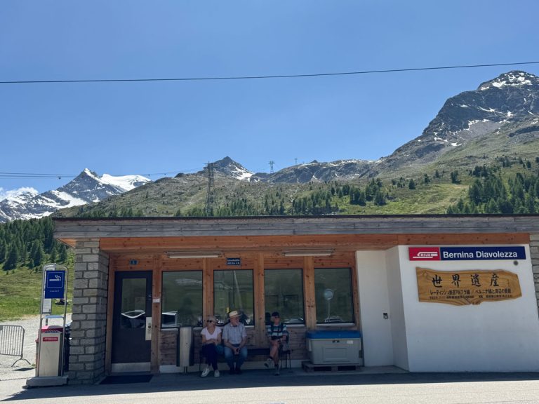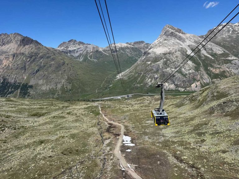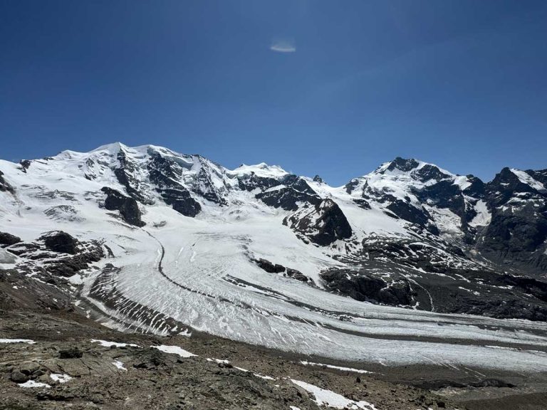氷河の一部には、白い布のようなカバーが掛けられている。これは氷河の融解を少しでも遅らせるための保護シートであり、強い日射から氷を守る“反射板”ともいえる存在だ。そんなことで温暖化から氷河を守れるのか?と笑ってはいけない。スイスではペルス氷河のほか、ツェルマットのマッターホルン・グレッチャー・パラダイスなどでも同様の保護が施されているのだから。遠目には雪のようにも見えるため、観光客への“演出”か?と勘違いしてしまいそうだが、本来の氷河の色=グレイシャーブルーが失われつつある現実に、自然の美しさと儚さ、人の手による保護の限界を感じずにはいられない。