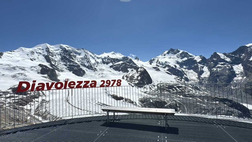 イタリア・ロンバルディア州の小さな町、ティラノを出発しスイスのサン・モリッツへ向かう、世界遺産にも登録されたベルニナ・エクスプレス。アルプスの渓谷を縫うように走り、乗客に連続する絶景を見せてくれる一度は乗ってみたい電車のひとつ。途中のベルニナ・ディアヴォレッツァ駅では、ロープウェイ乗り場が隣接しており、標高2,978メートルのディアヴォレッツァ山頂へ軽装で行くことができる。所要時間は約10分。しかしその短い間には車窓からの眺めとはまた違う、空に近い世界がそこに広がっている。