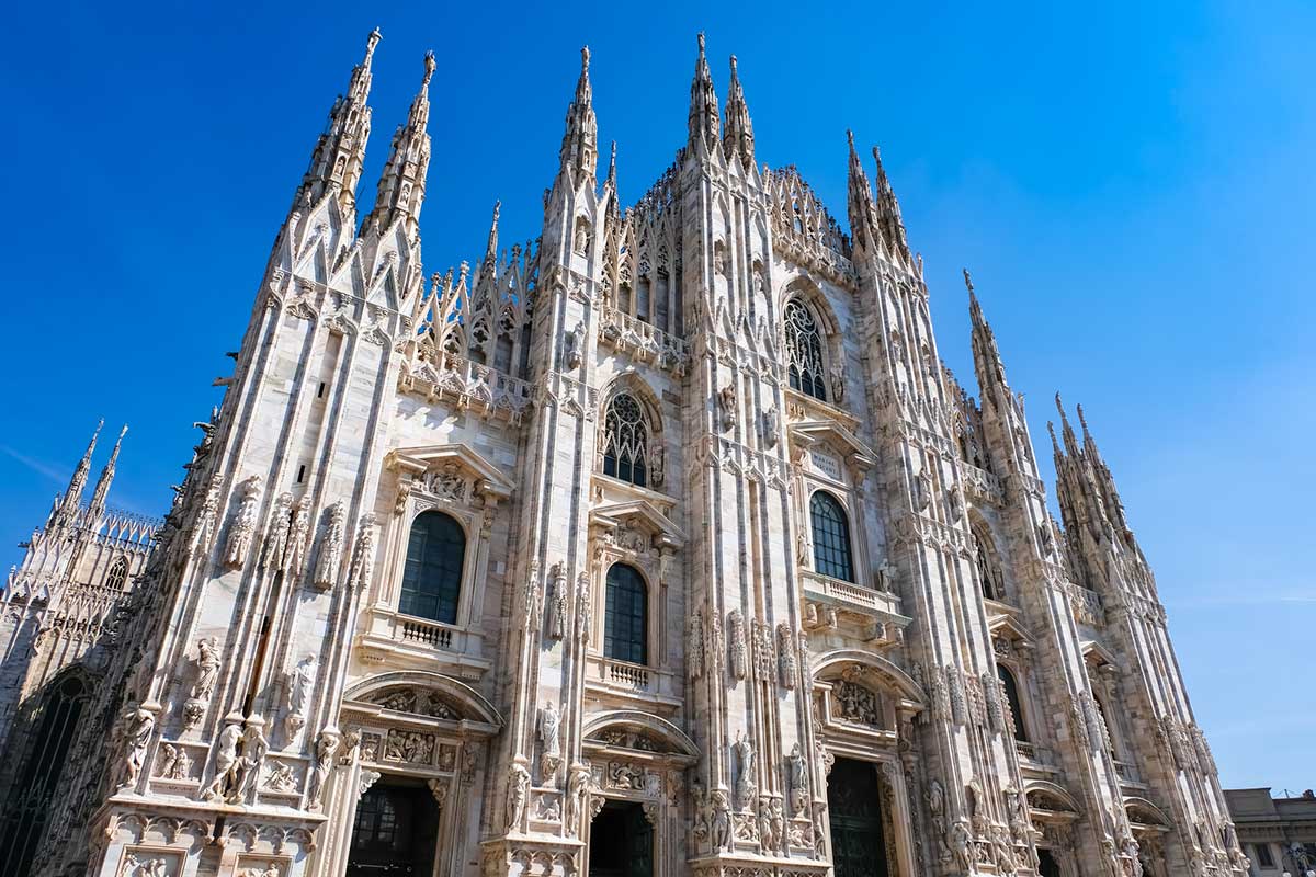 カンドリア産の白大理石で造られた外観には135本の尖塔がそびえ、最高所には黄金のマドンニーナ像が街を見守っています。内部は52本の巨柱に支えられた大空間となっており、聖書の物語を描いたステンドグラスが美しい光を投げかけます。