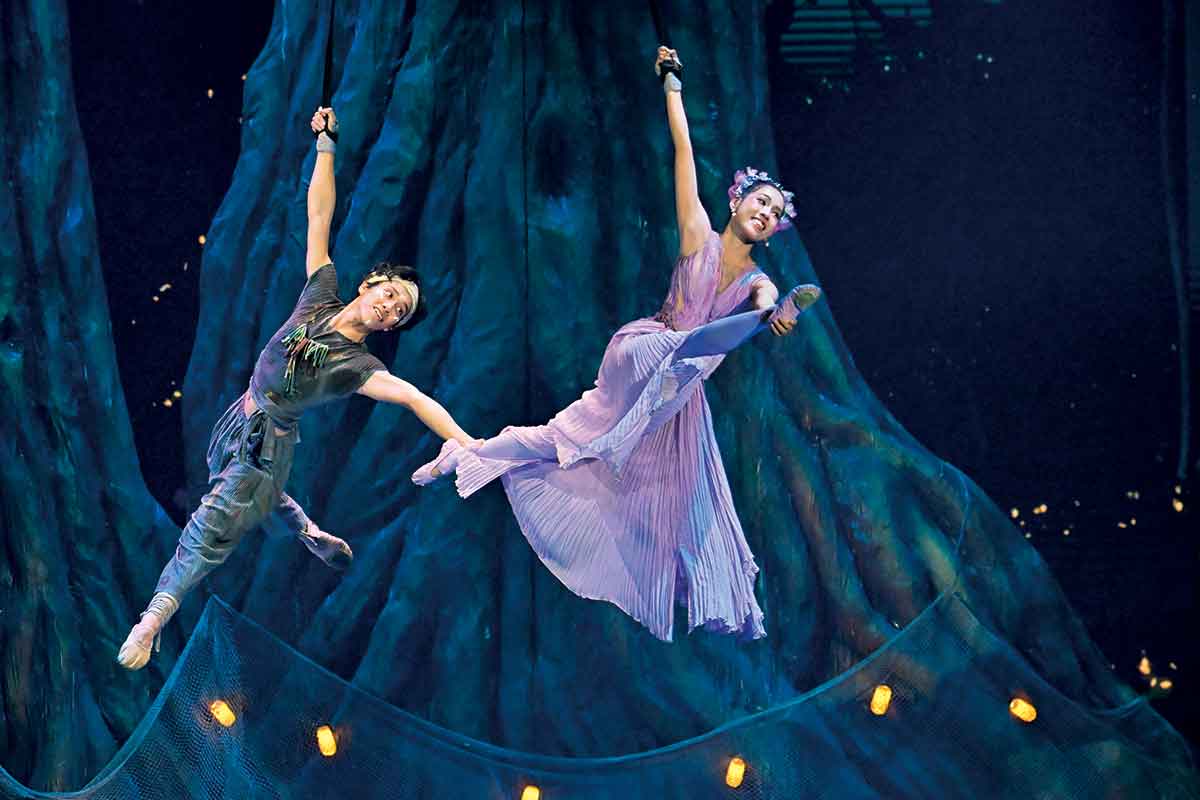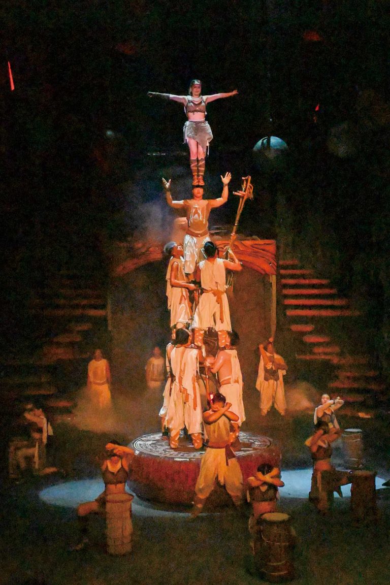干ばつに苦しむ村を救おうと、ふたりの若者が伝説の5つの雨石を求めて旅をする。五行思想を根底に、火や水、光、木などをふんだんに使い、サーカス学校出身の若者たちが、極限の技に挑戦している。休憩を含む約2時間半、息をするのも忘れそうなほどの迫力だ。