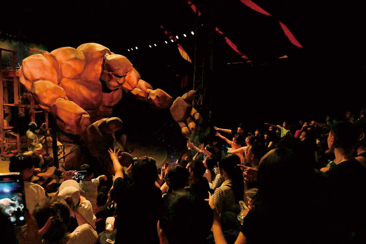 6mほどもある石の巨人や水の妖精の人形が操り棒で動き、観客と触れ合う。最後にはなんと、水を張った舞台に観客席の子どもたちが飛び出てきて、泳ぎ回る。グエン・クオック・コン監督は、「長年大切にしてきたサーカス芸術に対する観客の認識を変える大挑戦です」と言う。