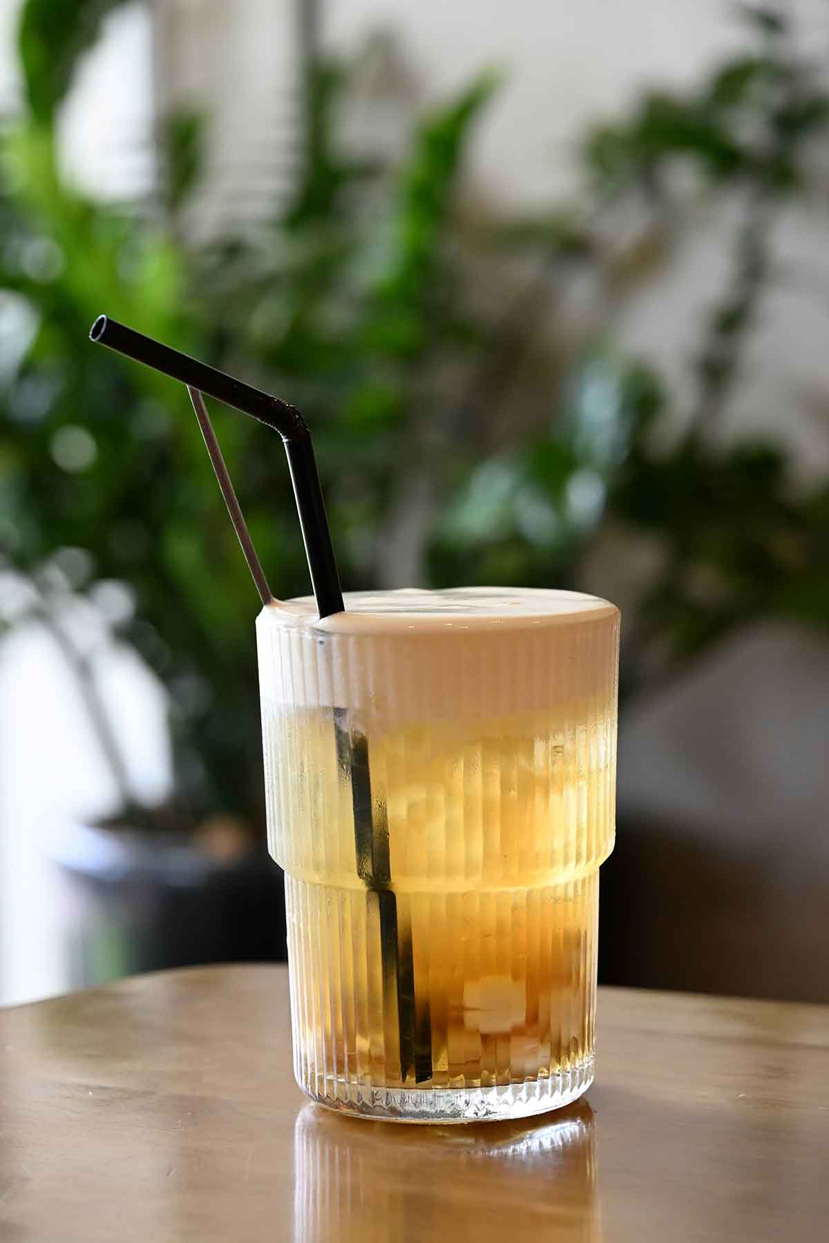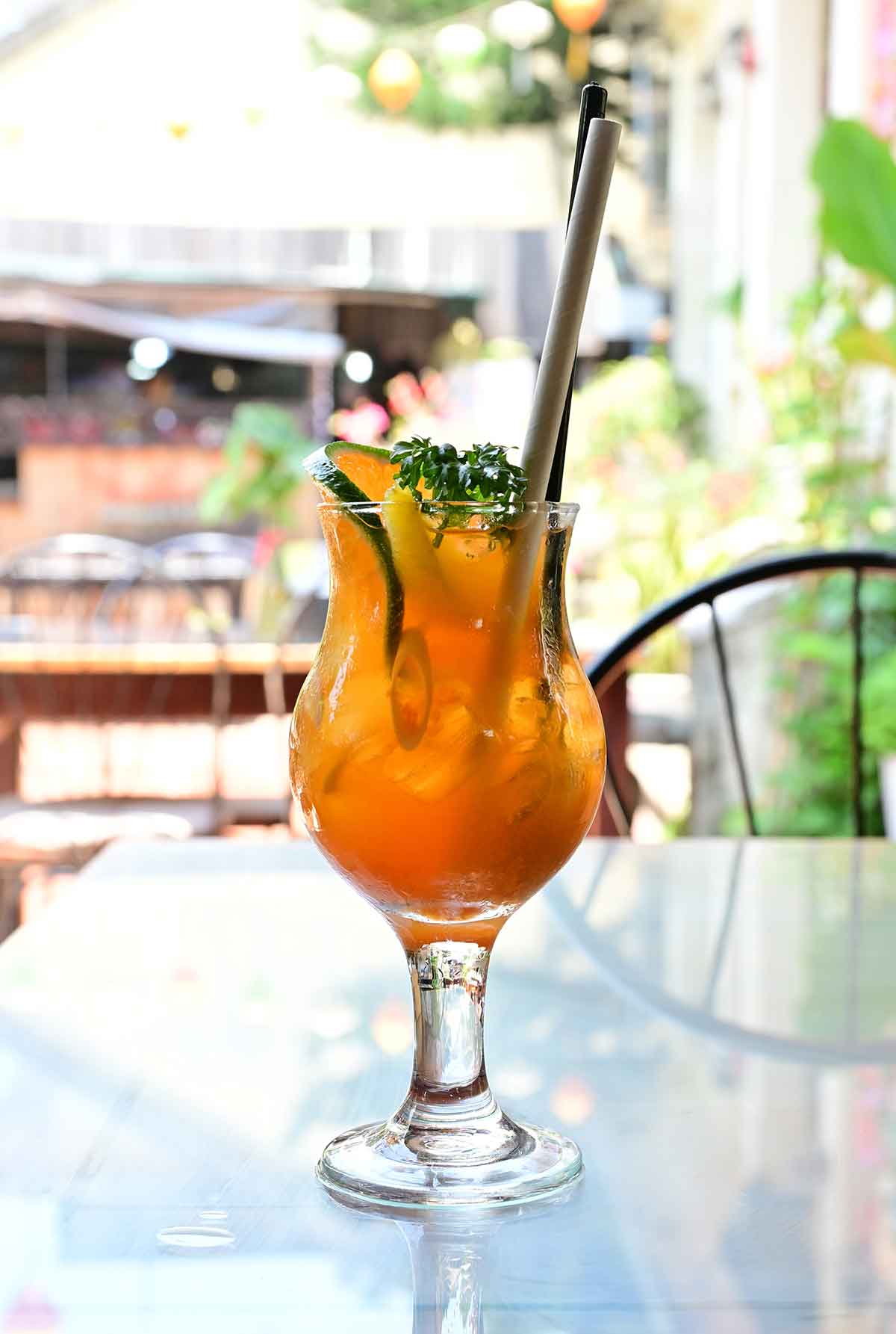 ホイアン旧市街にある「フレンチ・ハウス・レストラン(French House Restaurant)」では、テラス席で飲むピーチティー「チャーダオ」が最高だ。桃の果肉とレモングラスが入って、さわやかな香りが口に広がる。