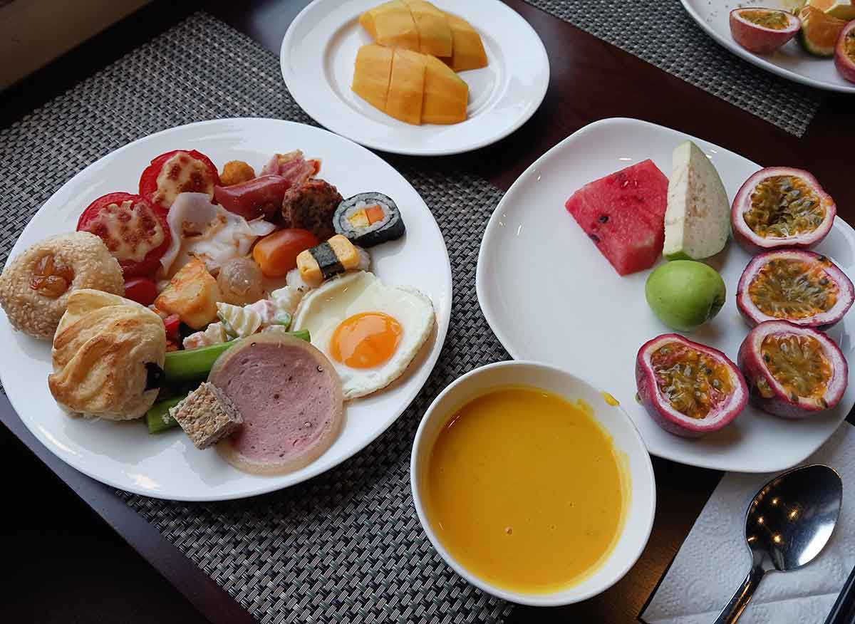 マンゴーやパッションフルーツが並ぶ食卓。なんて贅沢な朝だろう。